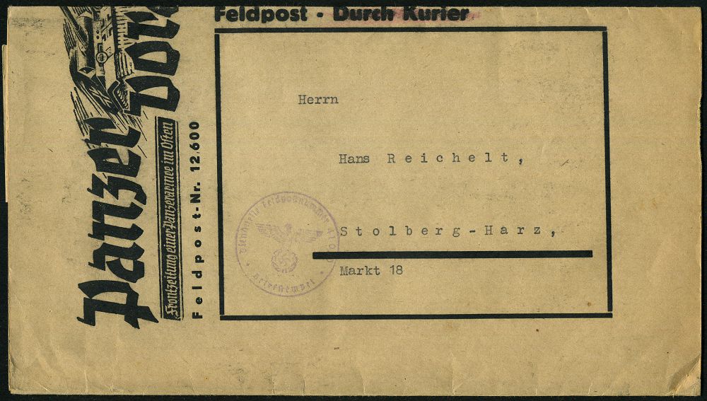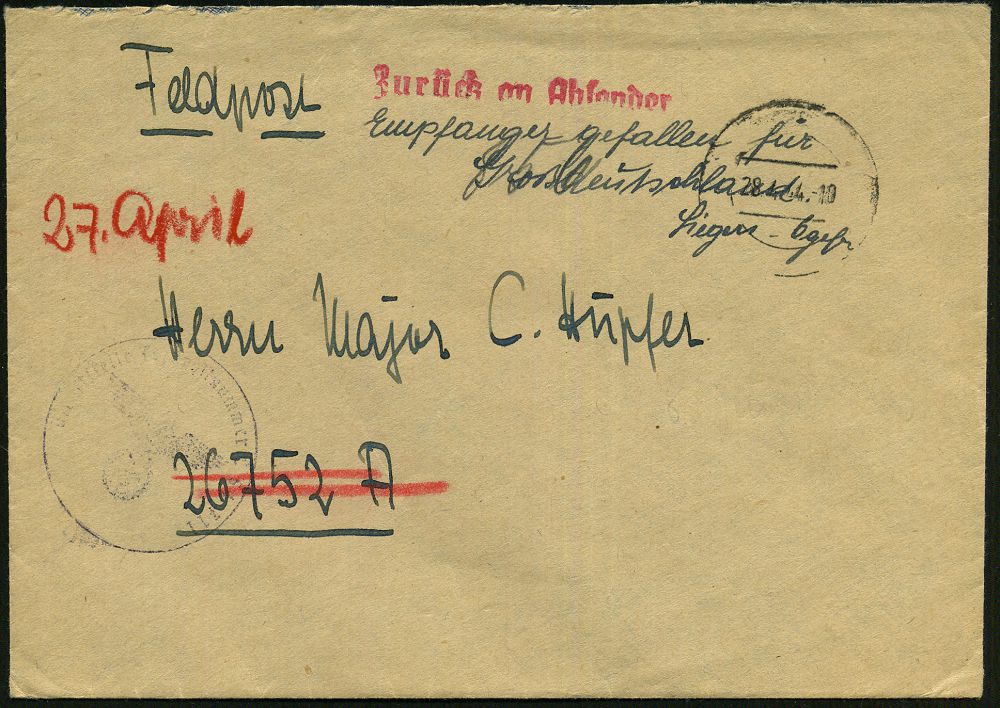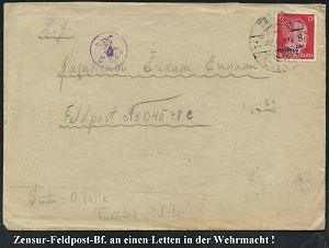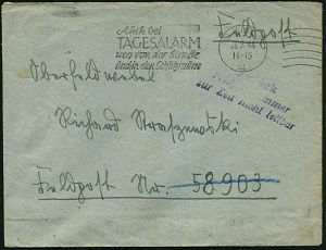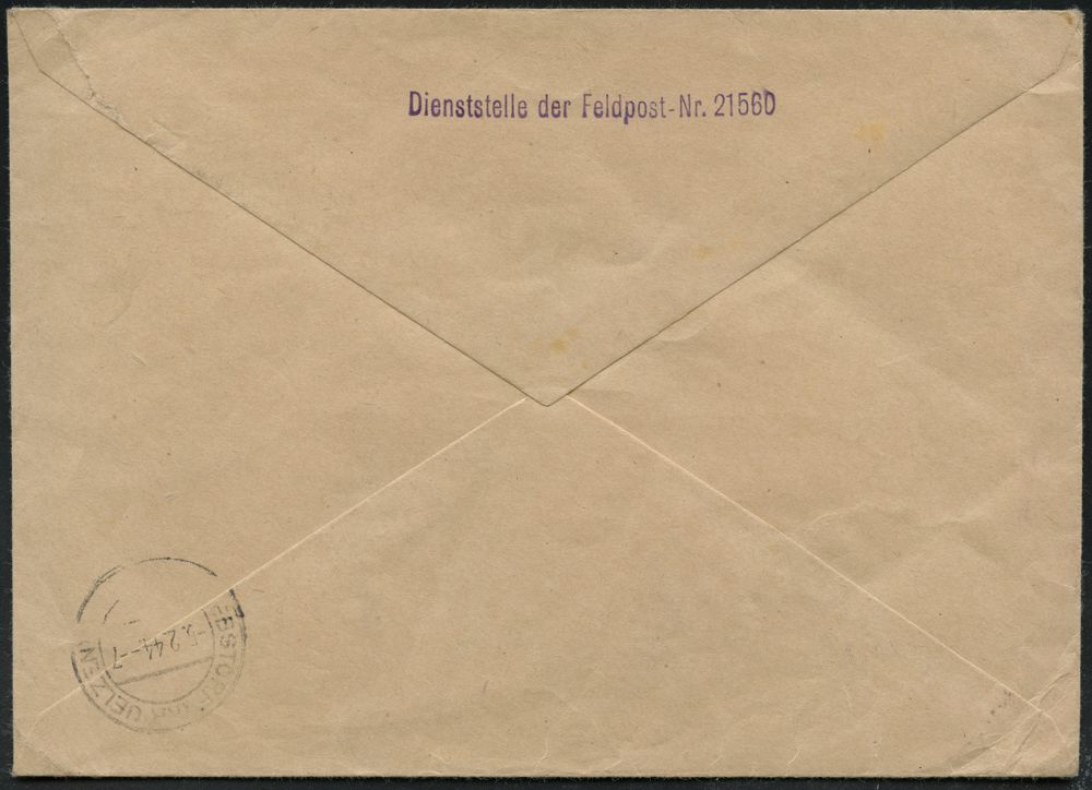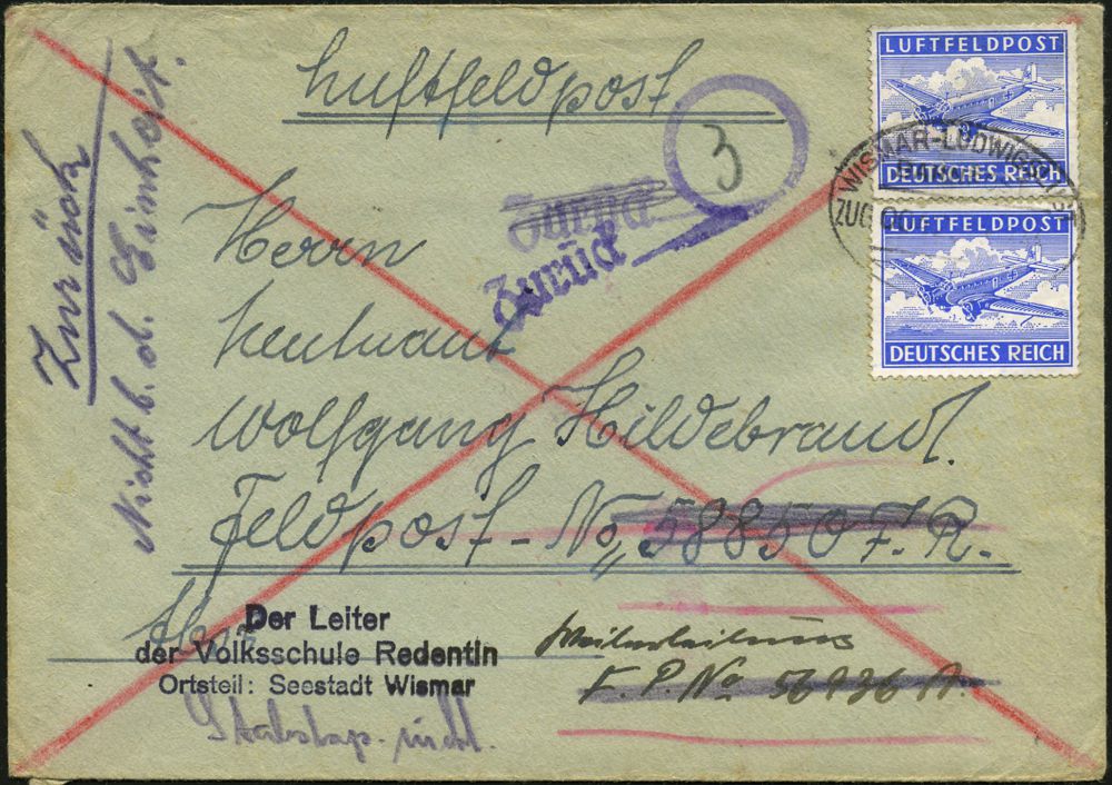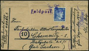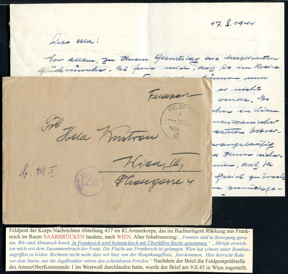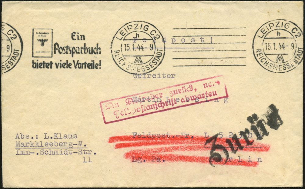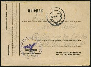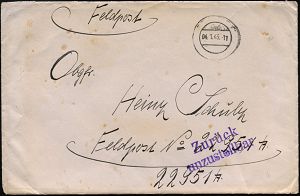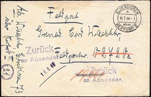 2135 | 45 € | II. WELTKRIEG (1939 - 1945) : BERLIN-ZEHLENDORF 1/ e 1944 (16.12.) 2K-Steg + viol. 1L: Zurück + 1K-HdN: Feldpost Nr. 48 127 E = gestrichenes Gren. Rgt. 753 , ursprünglich an Fp.-Nr. 08179 = Gren. Rgt. 953, überklebt mit Fp.-Nr. 48 127 D + hs. "neue Anschrift abwarten", Einheit kämpfte am Remagen-Brückenkopf! (siehe Legende!) Feldpost-Retour-Bf. + Inhalt kompl., seltener, später Beleg, am 13.3. in Berlin zurück! (ex Slg. Meschenmoser !) | ![]() ![]() ![]() | |