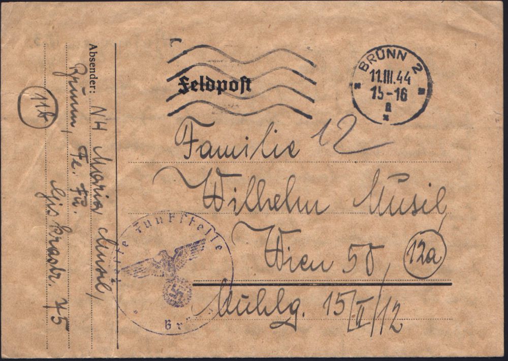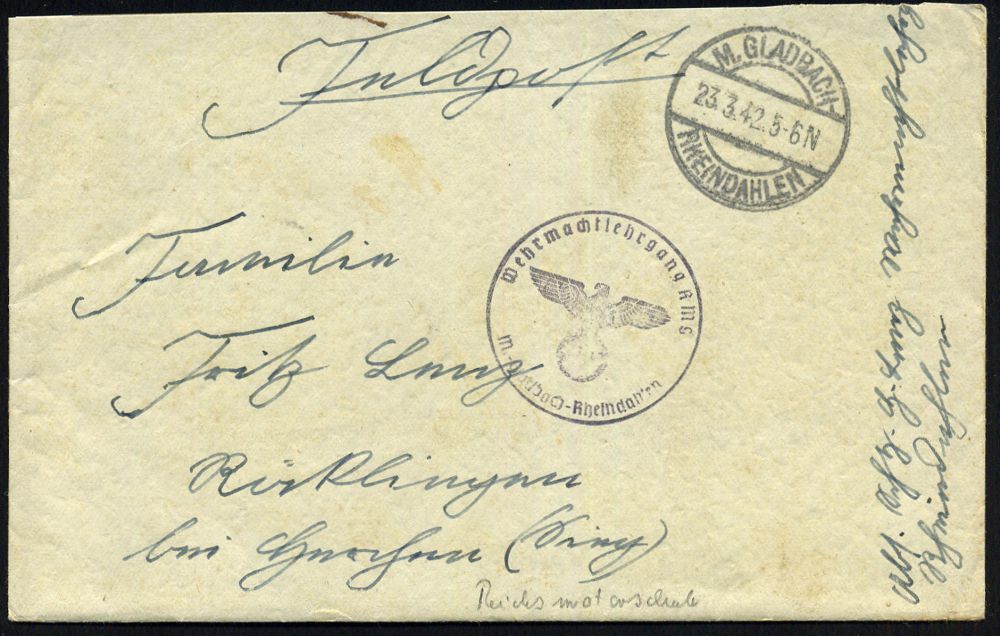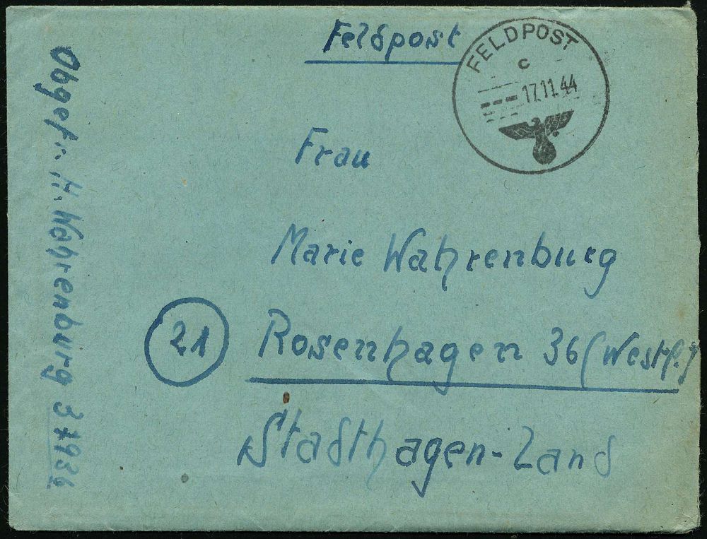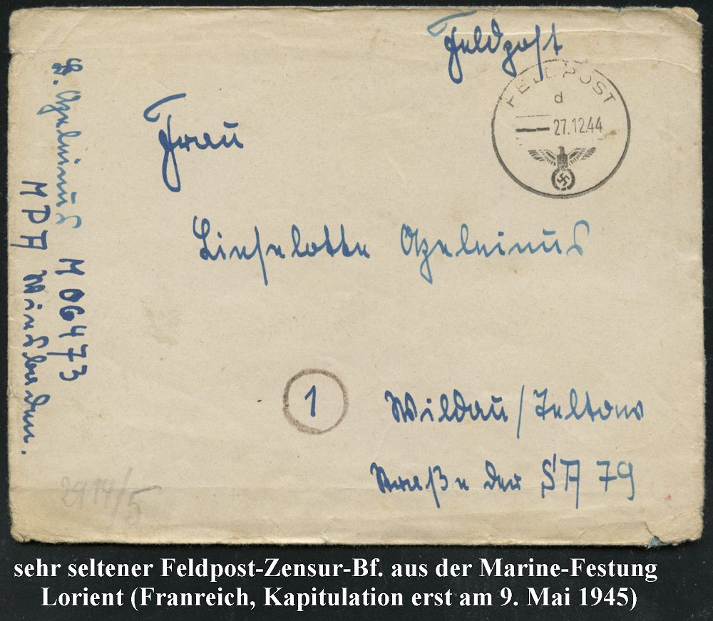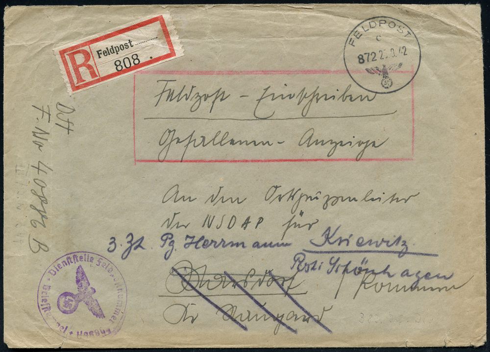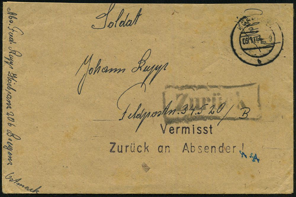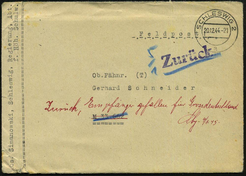 2135 | 45 € | II. WELTKRIEG (1939 - 1945) : BERLIN-ZEHLENDORF 1/ e 1944 (16.12.) 2K-Steg + viol. 1L: Zurück + 1K-HdN: Feldpost Nr. 48 127 E = gestrichenes Gren. Rgt. 753 , ursprünglich an Fp.-Nr. 08179 = Gren. Rgt. 953, überklebt mit Fp.-Nr. 48 127 D + hs. "neue Anschrift abwarten", Einheit kämpfte am Remagen-Brückenkopf! (siehe Legende!) Feldpost-Retour-Bf. + Inhalt kompl., seltener, später Beleg, am 13.3. in Berlin zurück! (ex Slg. Meschenmoser !) | ![]() ![]() ![]() | |