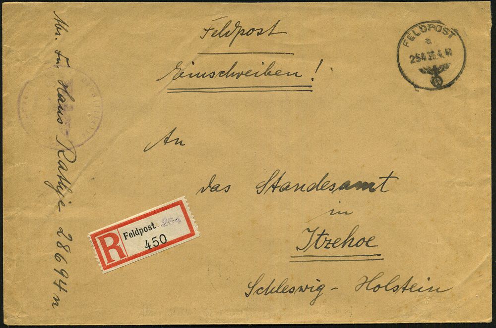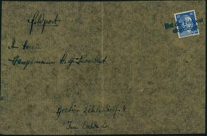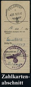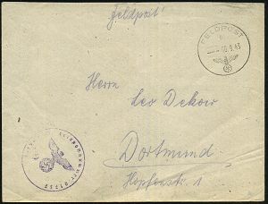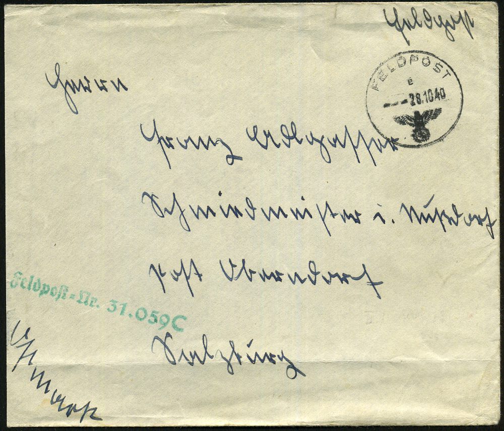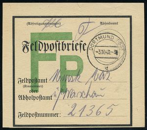 2150 | 25 € | II. WELTKRIEG (1939 - 1945) : DORTMUND PSST/ d 1940 (3.10.) 2K-Steg auf (Mi.8) zweifarbigem Vorbindezettel: FP Feldpostbriefe.. (Mi.13) an Fp.-Nr. 21365 in Minsk = Eisenbahn-Pionier-Regt. 6 (Mi.8 + 13, + 55.- EUR) | ![]() | |