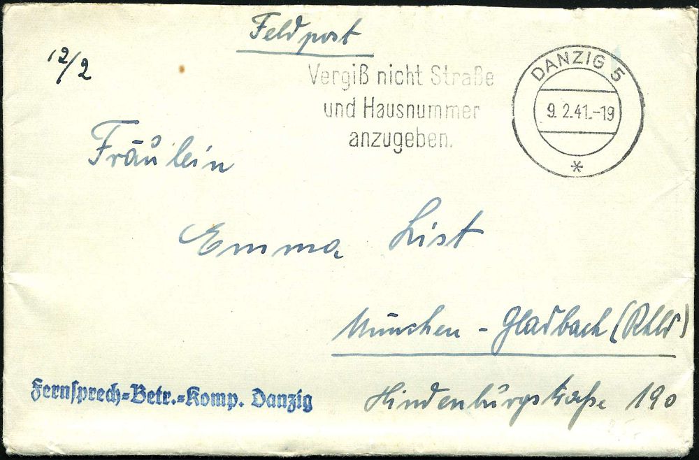 2147 | 18 € | II. WELTKRIEG (1939 - 1945) : DANZIG 5/ */ Vergiß nicht Straße/ u.Hausnummer.. 1941 (9.2.) Serien-MWSt + blauer 1L: Fernsprech-Betr.(iebs)-Komp. Danzig , klar gest. Feldpost-Bf. + viel Inhalt! (4 handgeschr. Briefbogen) n. M.-Gladbach; siehe auch Sektion: DANZIG (Handbuch Nr.53.2 + 20.- EUR, 2004) | ![]() ![]() ![]() | |