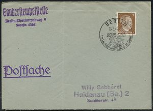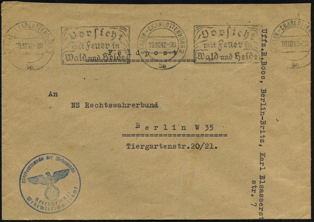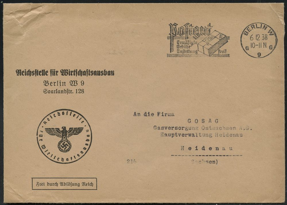 2091 | 20 € | II. WELTKRIEG (1939 - 1945) : BERLIN NW7/ mp/ Vorsicht/ mit Feuer in/ Wald u.Heide 1938 (10.6.) MaWSt auf Dienst-Bf.: Reichsstelle für Wirtschafts-ausbau.. Frei durch Ablösung Reich (NS-Adler) = Behörde, um Wirtschaft kriegsbereit u. -fähig zu machen!, (Bo.S 166 A) | ![]() | |