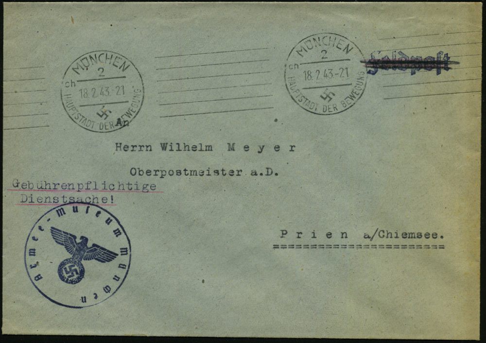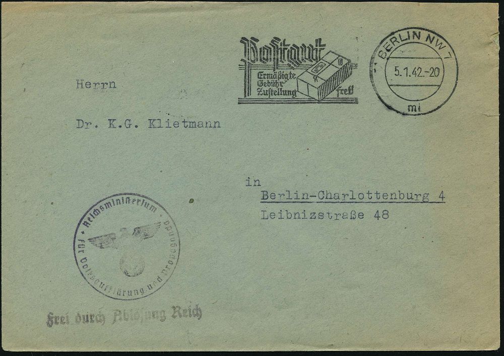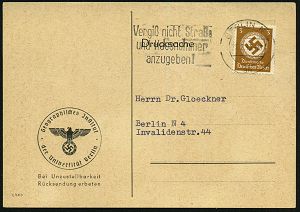2107 | 18 € | II. WELTKRIEG (1939 - 1945) : BERLIN NW 7/ mi/ Postgut/ ermäßigte/ Gebühr.. 1942 (5.1.) MWSt + viol. 1L: FdAR + 1K-HdN: Reichsministerium/für Volksaufklärung u. Propaganda , Orts-Dienstbf. (kl. Randrißchen u. schwache Bräunung), Minister 1942 = Joseph Goebbels, berühmt durch seine Rede: "..wollt Ihr den totalen Krieg ?!" | ![]() | |