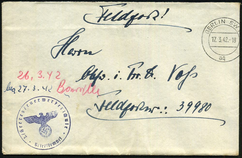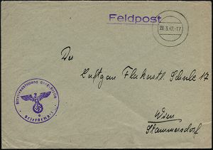 2108 | 18 € | II. WELTKRIEG (1939 - 1945) : BERLIN SW 11/ aq 1942 (17.3.) 2K-MaSt. ohne Werbetext (rechts nicht ganz voll) + viol. 1K-HdN: 2/ Heeresfeuerwerkerschule = Bomben- u. Blindgäner-Entschärfung etc., Feldpost-Bf. + interess. Inhalt über Feuerwerker-Ausbildung! an Fp.-N. 39980, vergl. Los Nr. 2106, 2109 | ![]() | |