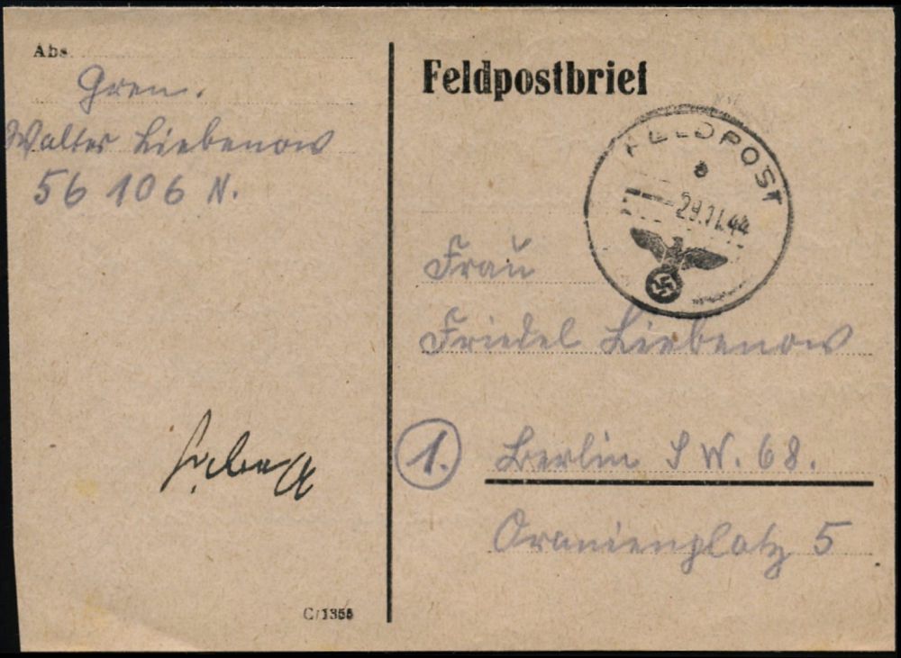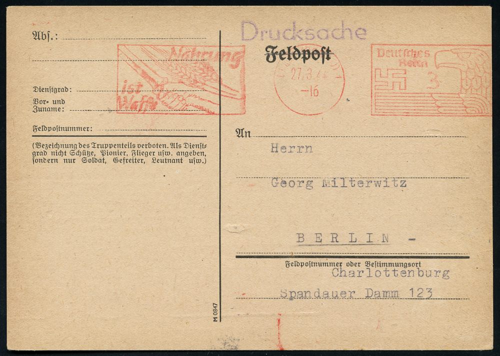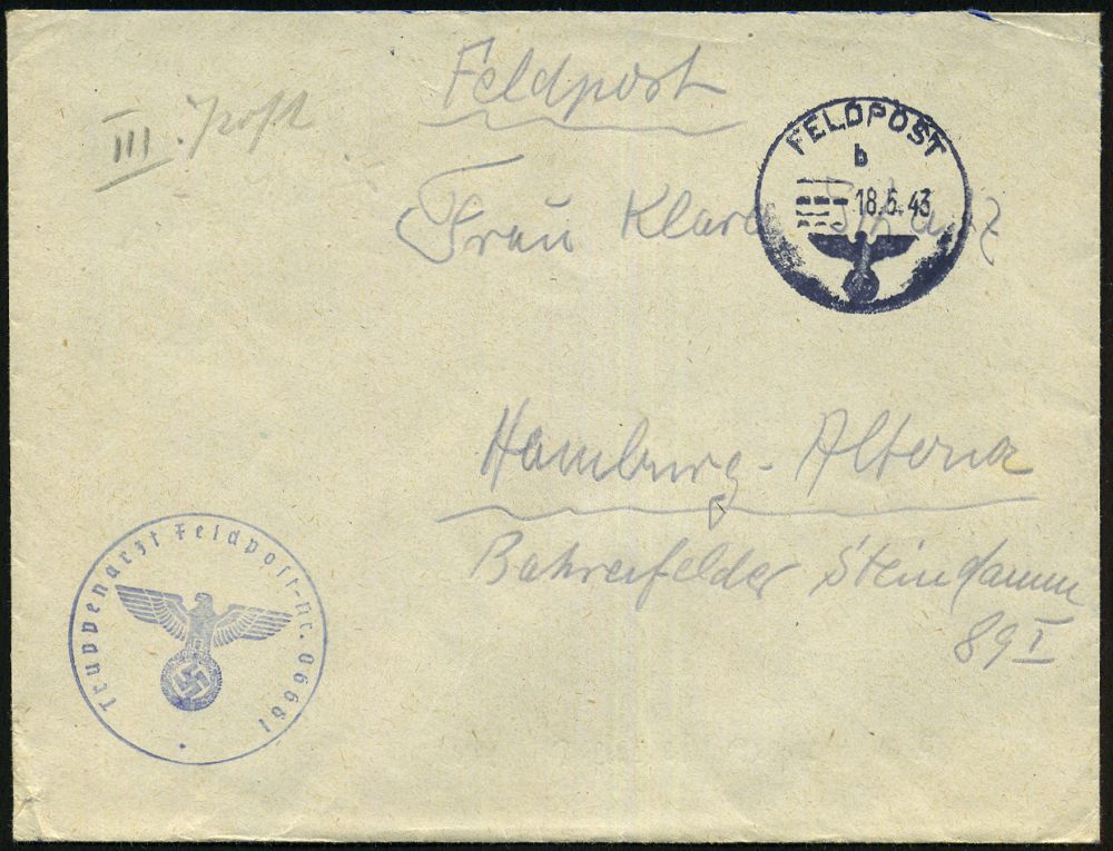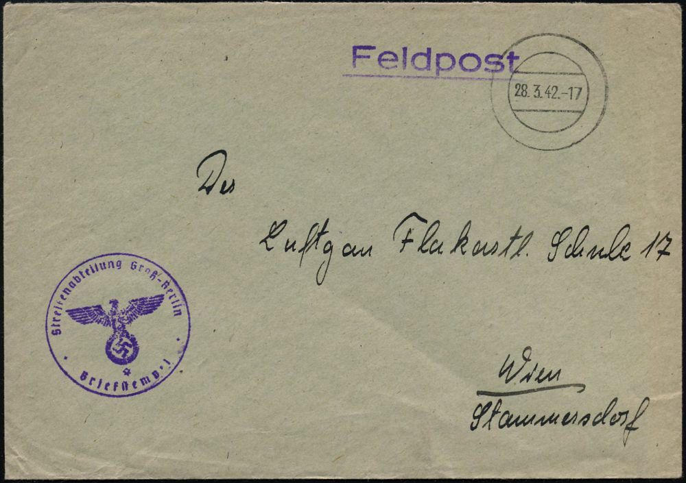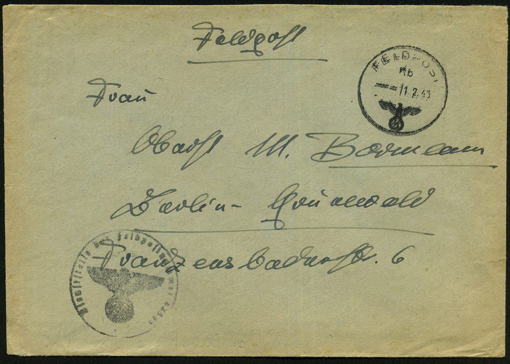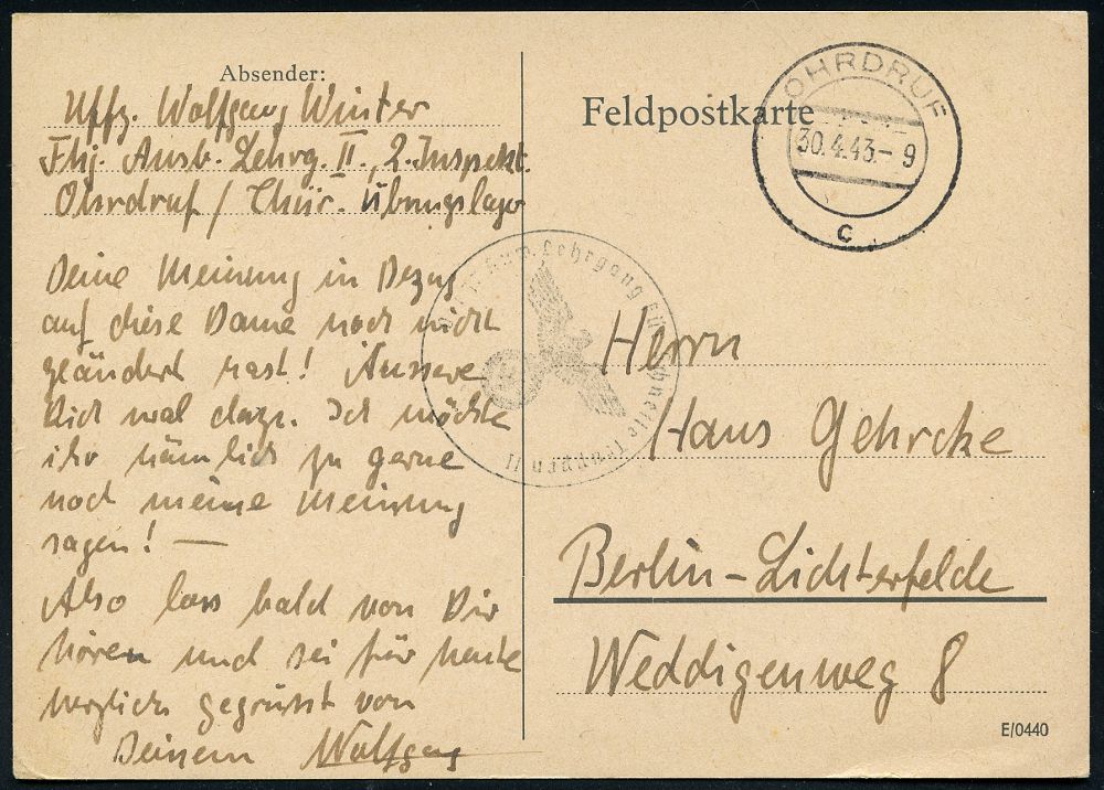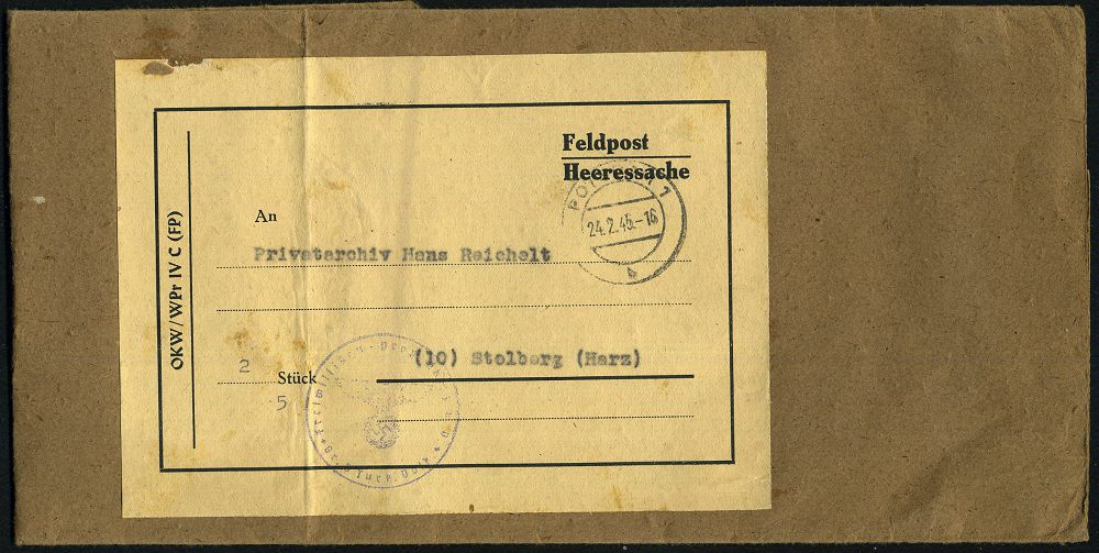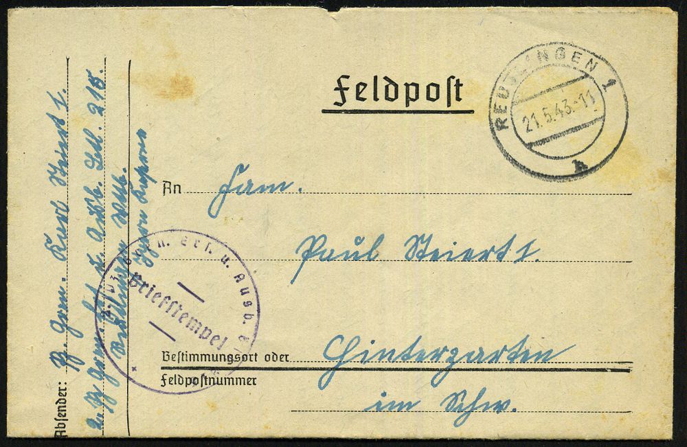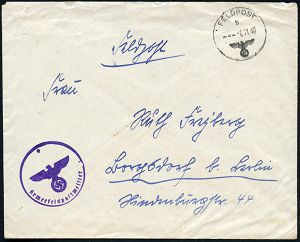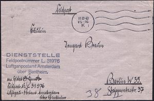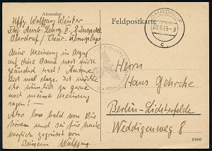 2128 | 18 € | II. WELTKRIEG (1939 - 1945) : BERLIN-CHARLOTTENBURG 2/ r 1943 (10.11.) Band-MaWellenSt + viol. 1K-HdN: Heeresplankammer = Wehrmachts-Landkarten-Zentrale + hs. Abs. (Lützowstr. 60) Feldpost-Bf. + Inhalt n. Bramsche, interessante u. seltene Dienststelle | ![]() | |