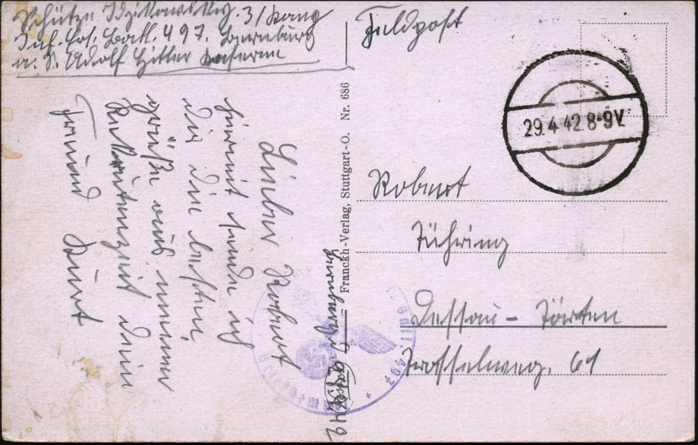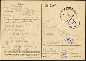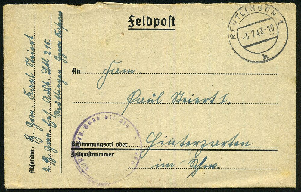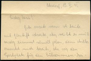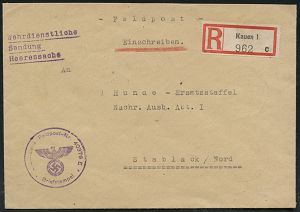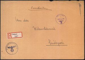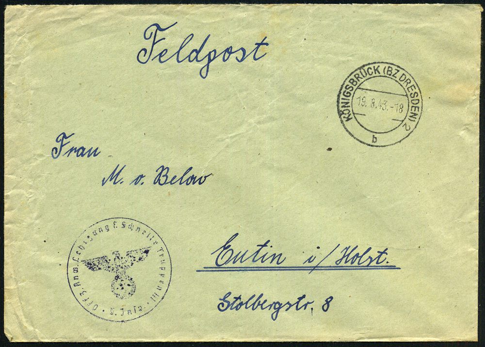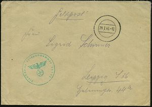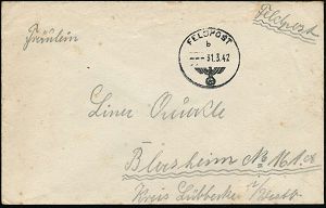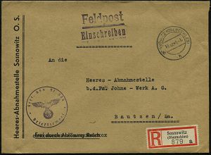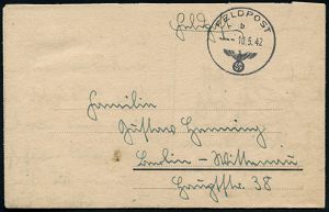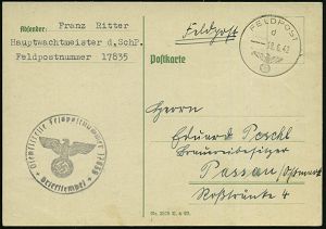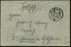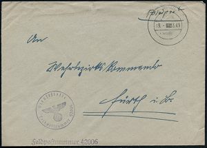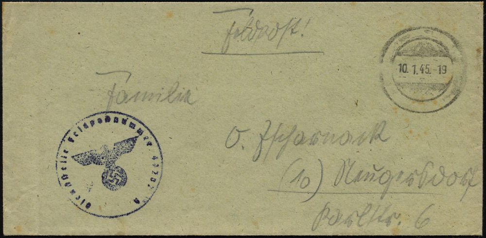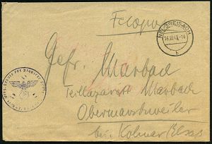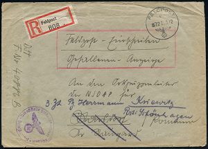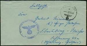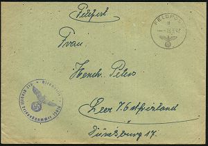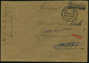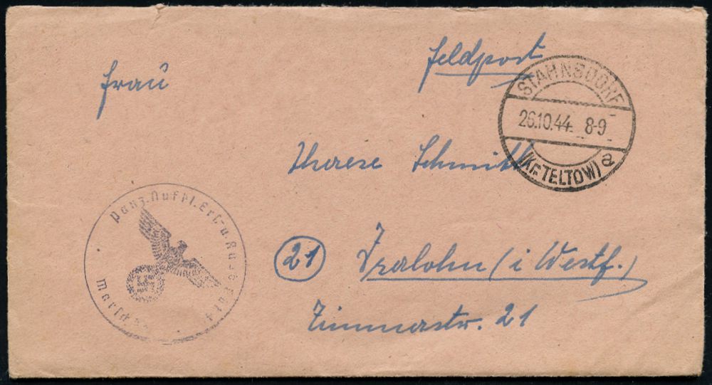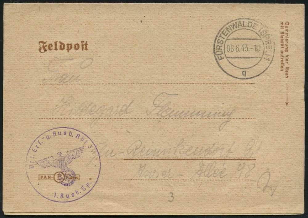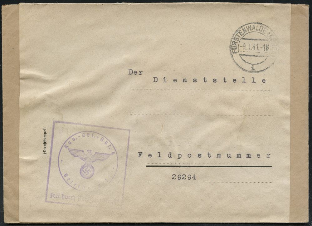 2166 | 30 € | II. WELTKRIEG (1939 - 1945) : FÜRSTENWALDE (SPREE) 1/ q #bzw.# i 1941/43 2 verschiedne 2K-Steg-Stpl. + viol. 1K-HdN: Kav.(allerie)-Ers. Abt. 9 (1x), Lehr u. Vers.(uchs) Vet.(erinär) Komp. (2x) bzw. Vet.(erinär) Ers.- u. Ausb. Abt. 3 , je rs. hs. Abs., 5 klar gest. Feldpost-Briefe, 1x Falt-Bf. mit Inhalt, 1x Brief-Inhalt, 5 Belege | ![]() ![]() ![]() ![]() ![]() | |