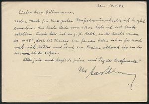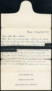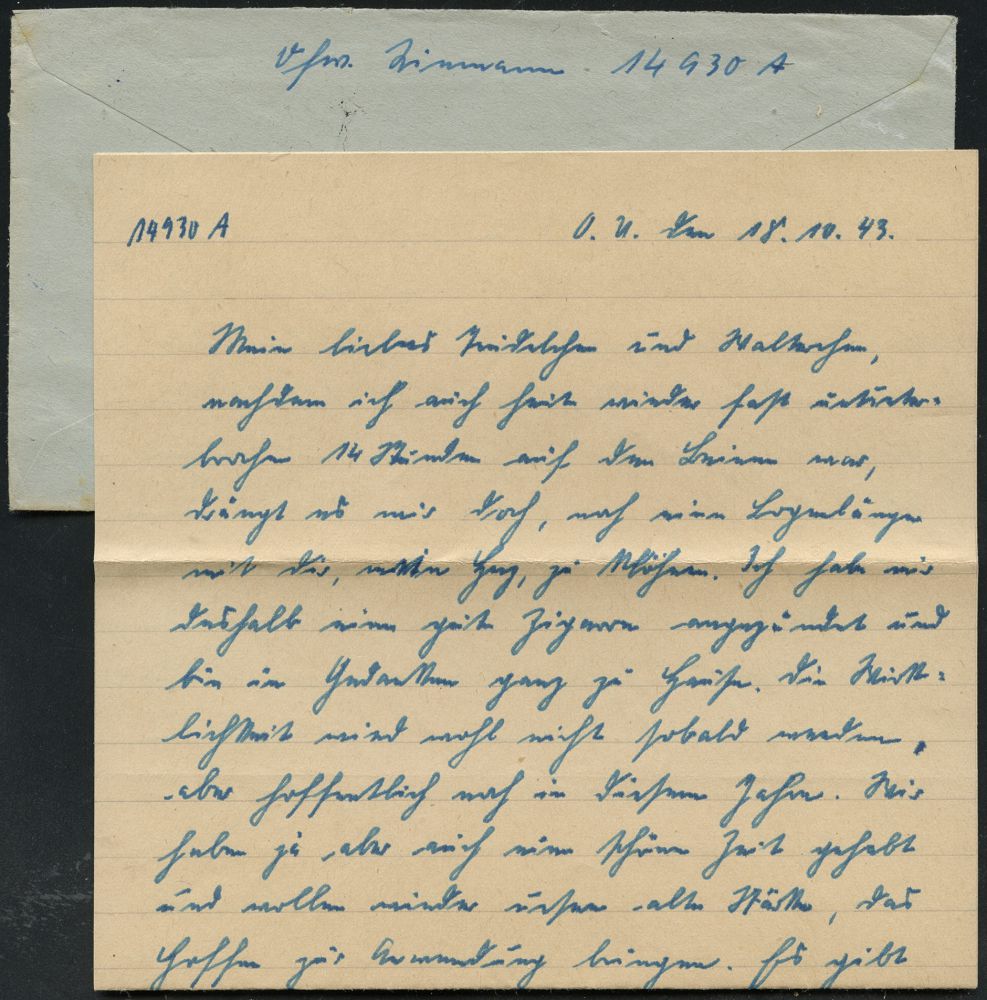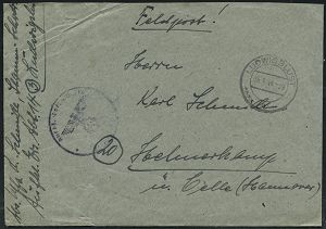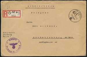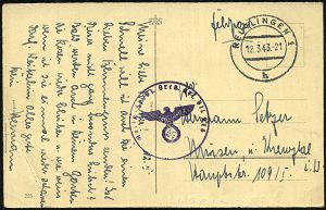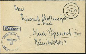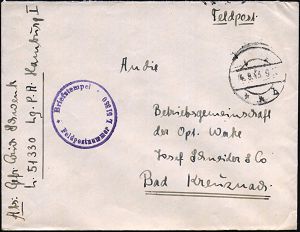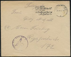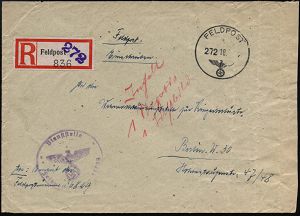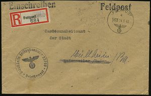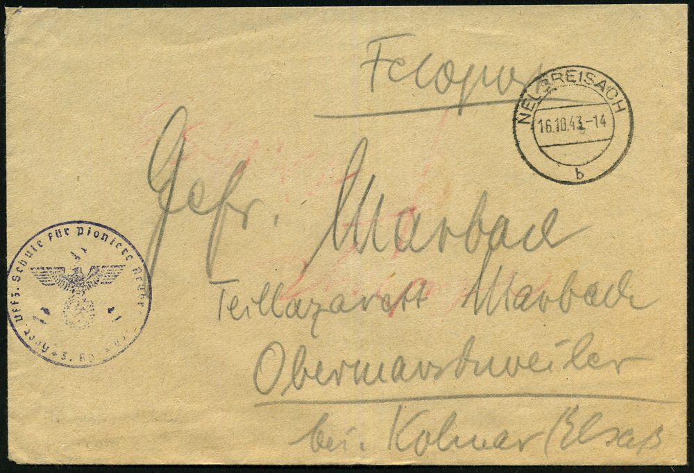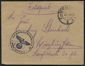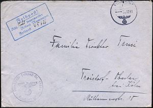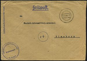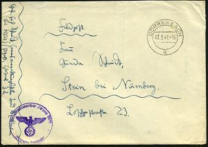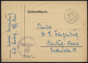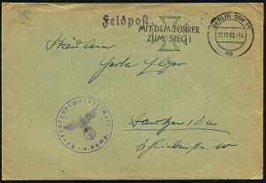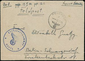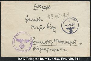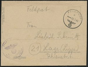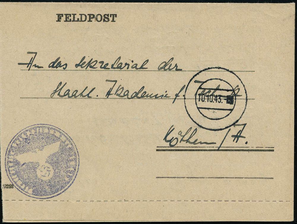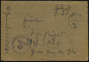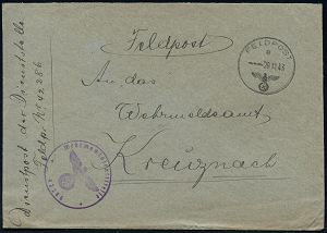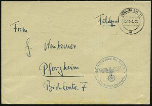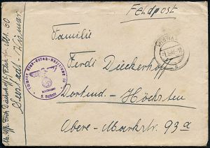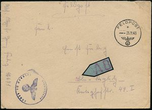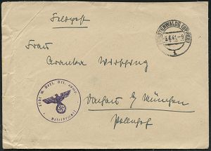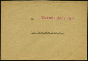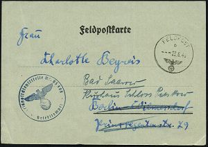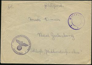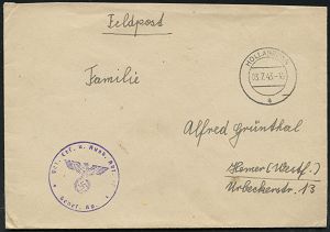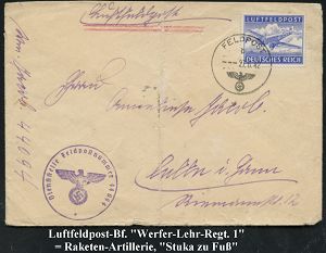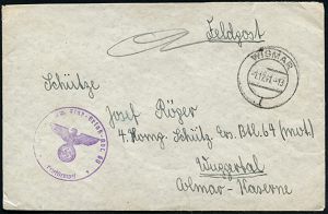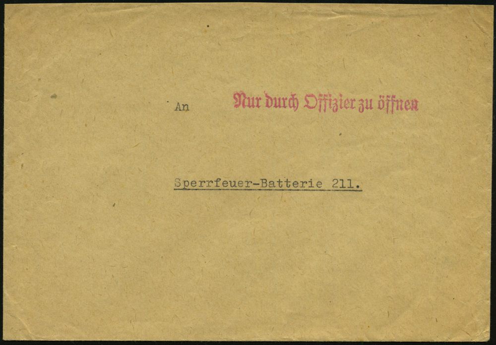 2106 | 25 € | II. WELTKRIEG (1939 - 1945) : Berlin SW 11 1941/44 viol. 1K-HdN: Heeresfeuerwerkerschule/3. Komp. bzw. 4. Komp. auf 2 Feldpost-Briefen mit Inhalt = Schule für Pyrotechnik, Munitions- u. Bomben-Entschärfung, 2 Belege, vergl. Los Nr. 2108-09 (Bo.S 388 A, S 412 A) | ![]() ![]() ![]() | |