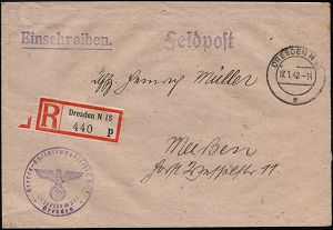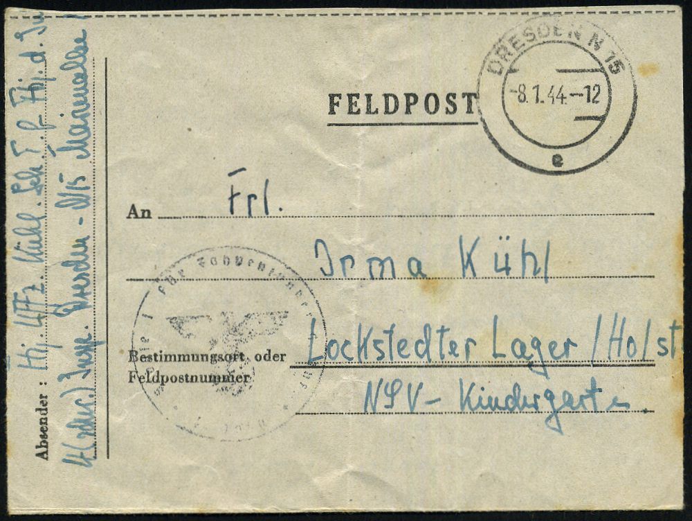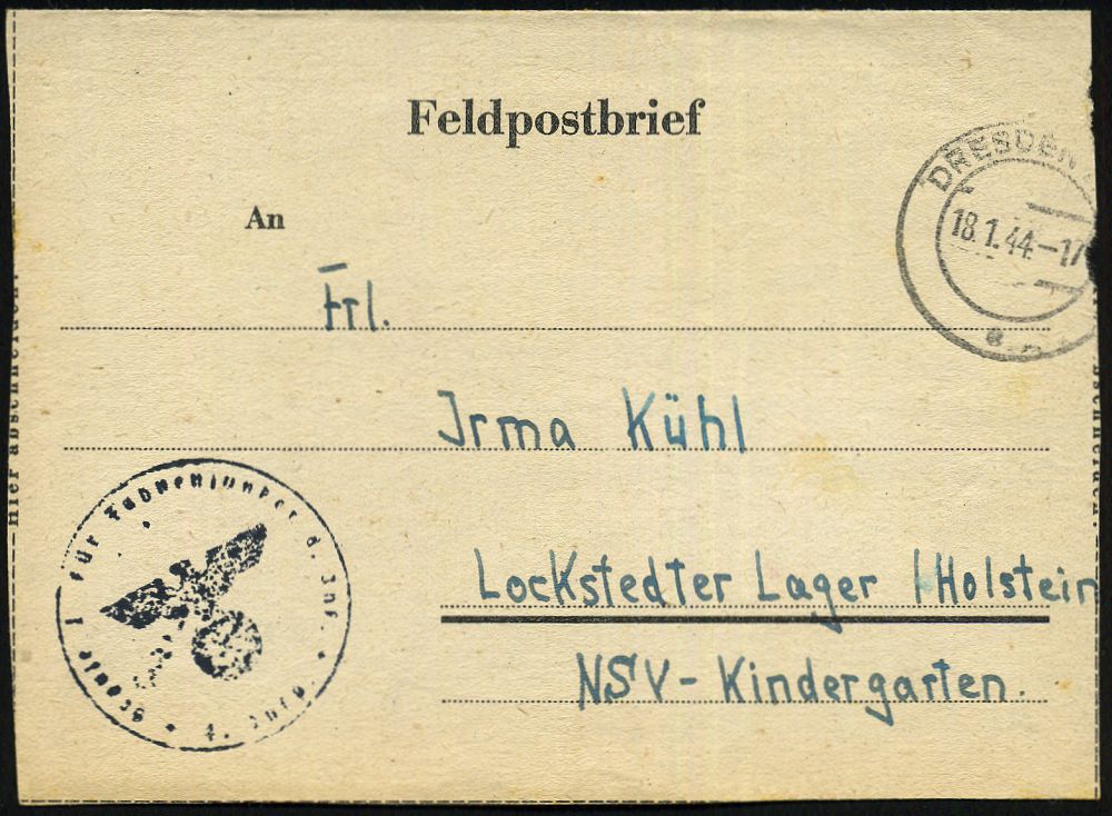 2153 | 16 € | II. WELTKRIEG (1939 - 1945) : DRESDEN N 15/ e 1944 (8.1./18.1.) je 2K (1x nicht voll) + 2x viol. 1K-HdN: Schule für Fahnenjunker d. Jnf.(antrie) + hs. Abs., 2 Feldpost-Falt-Briefe mit Inhalt an Locksteder Lager, NSV-Kindergarten !, 2 Belege | ![]() ![]() | |