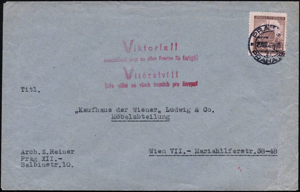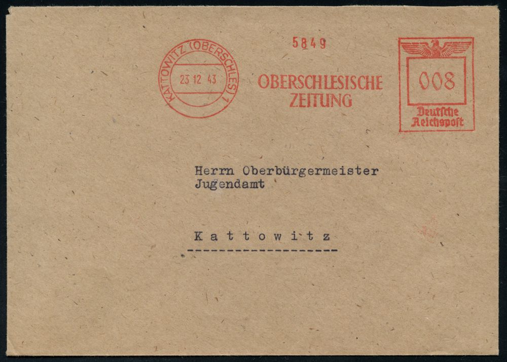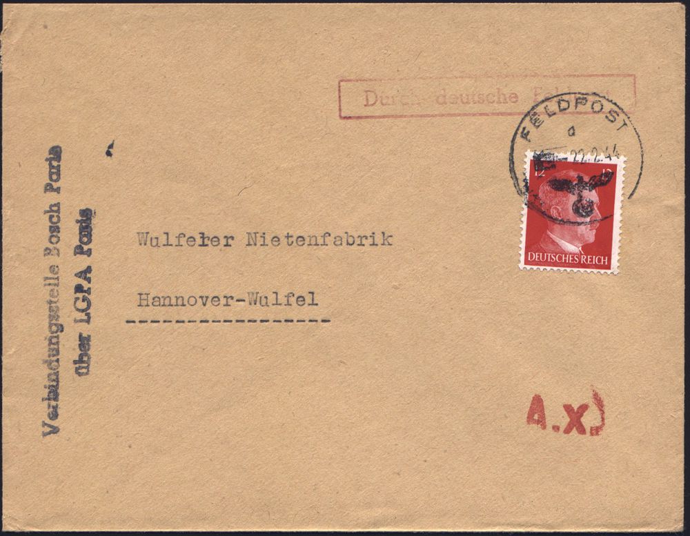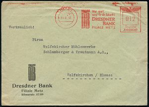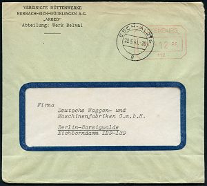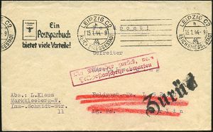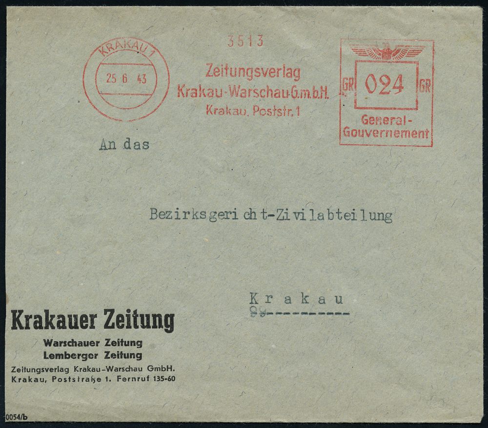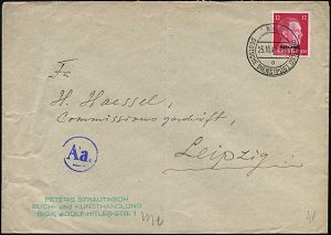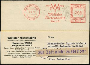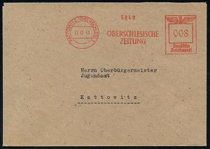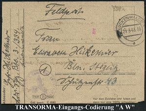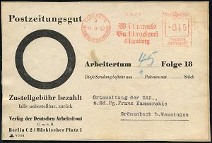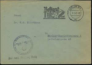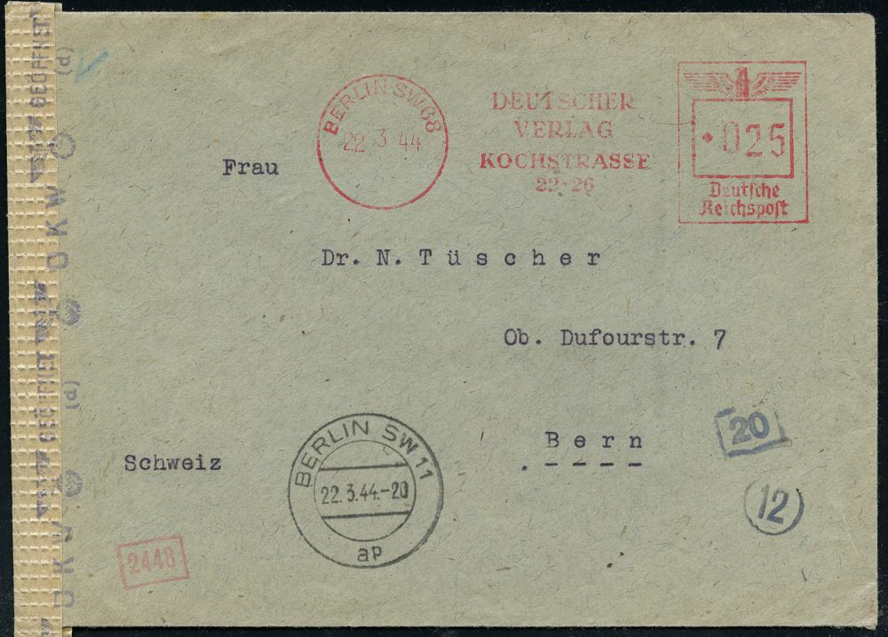 2132 | 30 € | II. WELTKRIEG (1939 - 1945) : BERLIN SW/ 68/ DEUTSCHER/ VERLAG/ KOCHSTRASSE/ 22-26 1944 (22.3.) AFS Francotyp "Reichsadler" 025 Pf. = "arisierter" Ullstein-Verlag , Zwangsverkauf Juni 1934 an Cautio GmbH = NSDAP-Tarnfirma (Max Winkler!) rs. Abs.-Vordruck: DEUTSCHER VERLAG.. + OKW-Zensur: GEÖFFNET/d + neutraler Streifen = München (Rie.D-21 b) Ausl.-Zensur-Bf. n. Bern (Dü.E-5DG) | ![]() ![]() | |