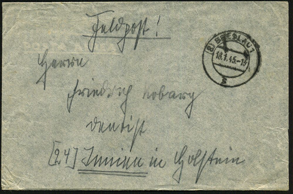 2144 | 25 € | II. WELTKRIEG (1939 - 1945) : (8) BRESLAU 1/ s 1945 (18.1.) 2K-Steg mit Postleitzahl ! + rs. hs. Fp.-Abs.: "..Leutnant.. z. Zt. Breslau, Gren.(adier) Kaserne" (rs. u. seitl. Riß) später Feldpost-Bf. + Inhalt, Breslau war ab 15.2. Festung! n. Innien/Holst. | ![]() | |