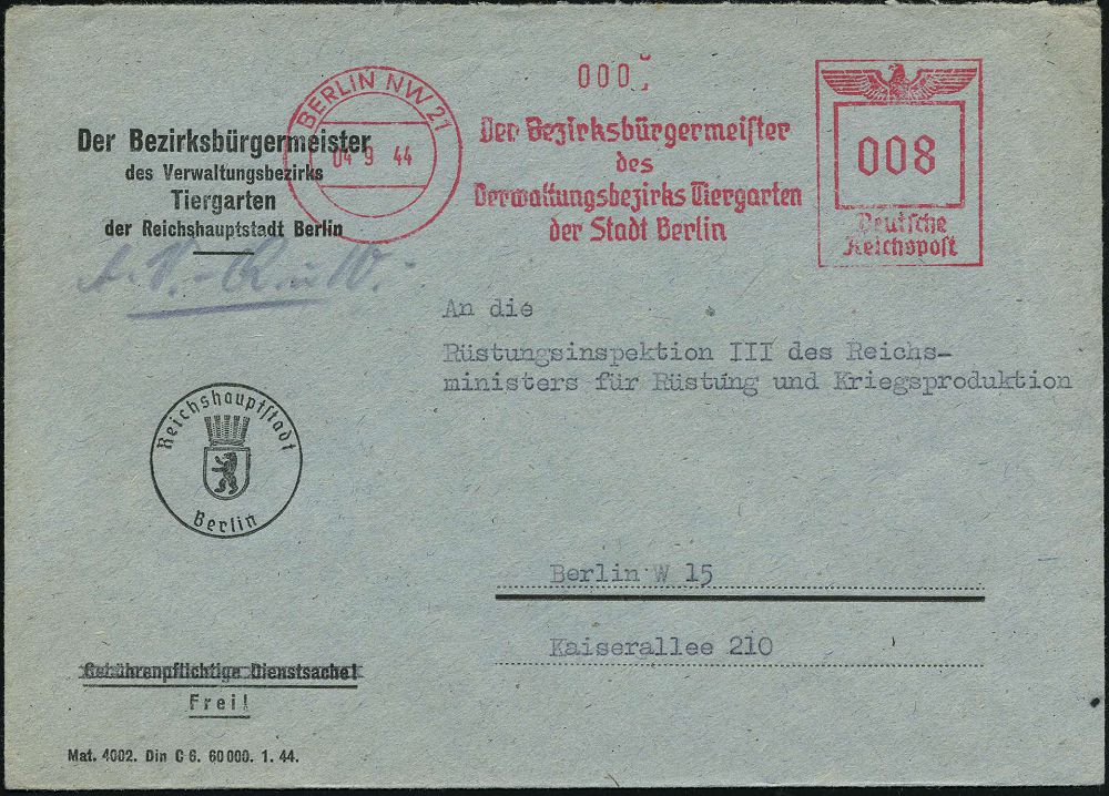 2133 | 16 € | II. WELTKRIEG (1939 - 1945) : BERLIN NW 21/ Der Bezirksbürgermeister/ d./ Verwaltungsbezirks Tiergarten.. 1944 (4.9.) AFS Francotyp "Reichsadler" auf Orts-Dienst-Bf. an Reichsminister für Rüstung = Alb. Speer (Dü.E-5CGh) | ![]() | |