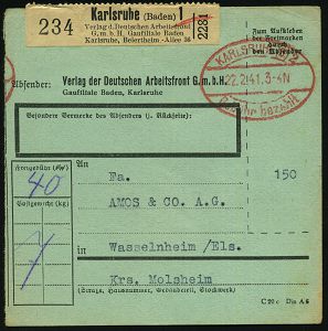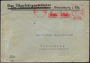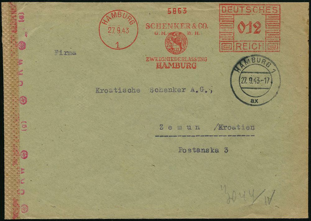 2177 | 22 € | II. WELTKRIEG (1939 - 1945) : HAMBURG/ 1/ SCHENKER & CO.. 1943 (27.9.) AFS Francotyp "Mäanderrechteck" 012 Pf. (Logo: Globus) + roter OKW-Band-Ma.Stpl.: "g" = Wien (Rie.G-27 b, G-54 a = neutraler Riffelstreifen) + 2K: HAMBURG 1/ax, Ausl.-Zensur-Bf. n. Zemun, Kroatien!, = Inlands-, Europa-Tarif! (Dü.E-2BAh) | ![]() ![]() | |