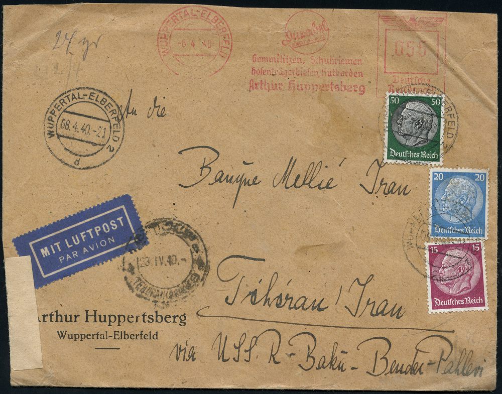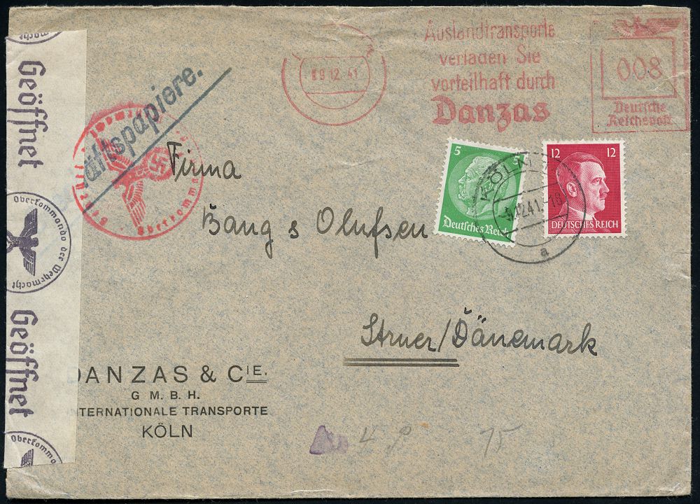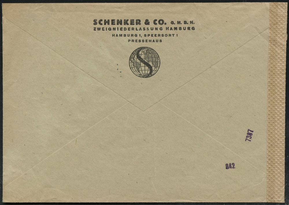 2176 | 25 € | II. WELTKRIEG (1939 - 1945) : HAMBURG/ 1/ SCHENKER & CO.. 1943 (9.4.) AFS Francotyp "Mäanderrechteck" 022 Pf. (Firmen-Logo: Globus) + viol. OKW-Zensur-1^K: A b = Berlin (Rie.B-32, + 50 Pkte.) rs. motivgl. Abs.-Vordruck, Ausl.-Flp.-Zensur-Bf. n. Kopenhagen, seltene Portostufe = Europa-Tarif 12 Pf. + 10 Pf. Lufttarif! (Dü.E-2BAh) | ![]() ![]() | |