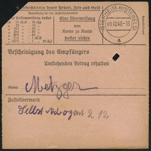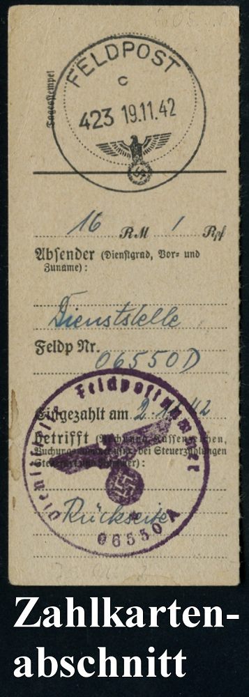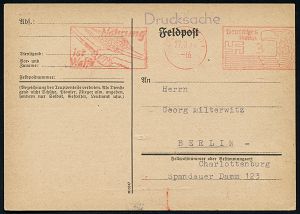 2114 | 18 € | II. WELTKRIEG (1939 - 1945) : BERLIN O17/ qq/ Altkleider-/ und/ Spinnstoffsammlung 1942 1942 (19.6.) seltener Serien-MaWSt (Eisernes Kreuz) klar auf Inl.-BiP 6 Pf. Hitler (Radiumbad Brambach) Bedarf, die Textil-Sammlung wurde verursacht durch die schlechte Winterausrüstung der Wehrmacht im Winter 1941/42 vor Moskau (Bo.S 392 A, nur 3 Wochen in nur 4 Orten verwendet !) | ![]() | |