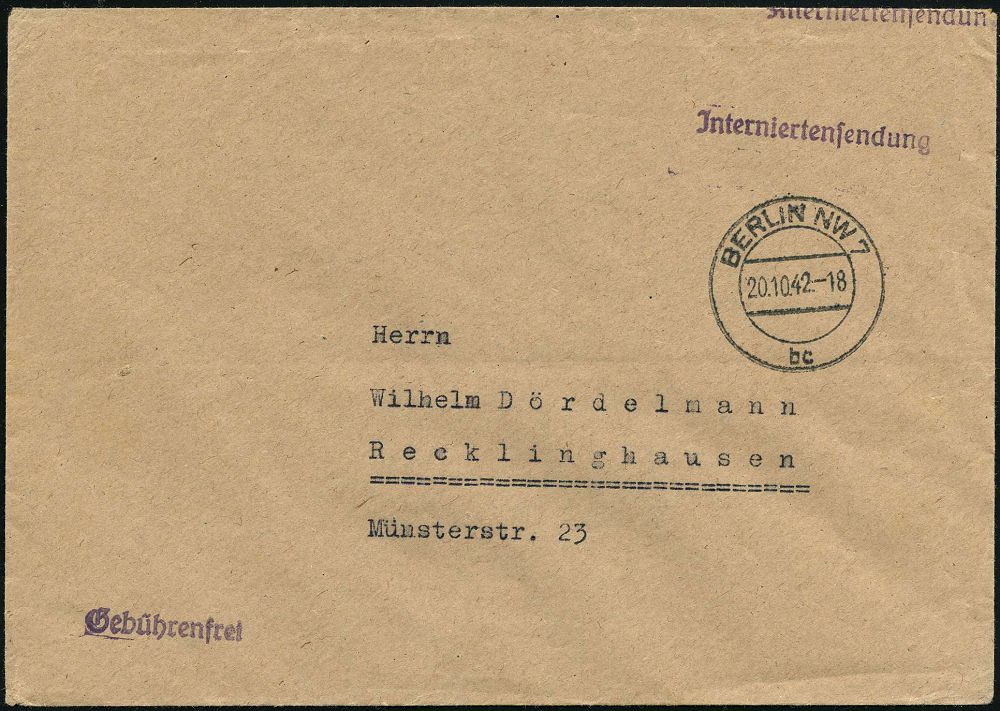 2118 | 30 € | II. WELTKRIEG (1939 - 1945) : BERLIN NW 7/ bc 1942 (20.10.) 2K-Steg + viol. 1L: Jnterniertensendung + 1L: Gebührenfrei , rs. viol. Ra.2: Auswärtiges Amt/ Berlin W 8, Kronenstr.10, seltener, portofreier Inl.-Dienst-Bf. n. Recklinghausen | ![]() ![]() | |