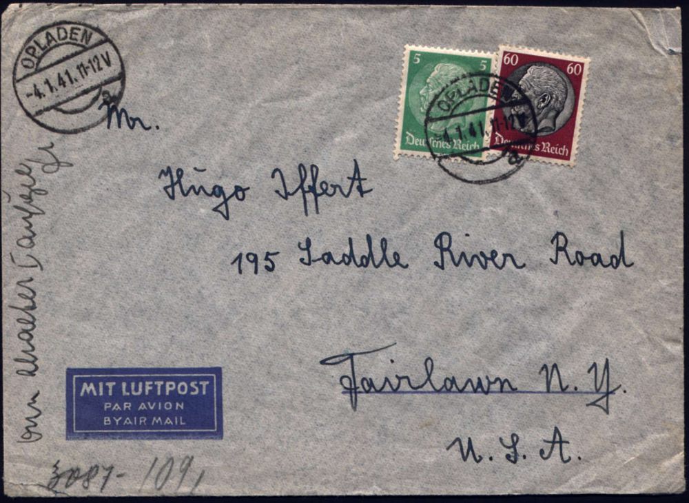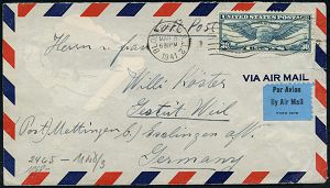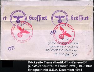 2605 | 18 € | II. WELTKRIEG (1939 - 1945) : U.S.A. 1941 (15.9.) MaWellenSt.: HESBROUCK HEIGHTS,N.J., EF 30 C. Transatlantik-Flp. via Lissabon, rs. OKW-Zensurstreifen + roter 1K: "e" (= Frankfurt/M., Rie.E-3 c, E-54) UB "e" nur Rest erkennbar, Übersee-Flp.-Zensur-Bf. n. Braunschweig kurz vor Kriegseintritt der USA ! (Mi.450 EF) | ![]() ![]() | |
