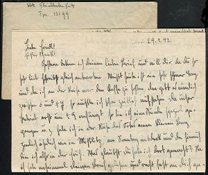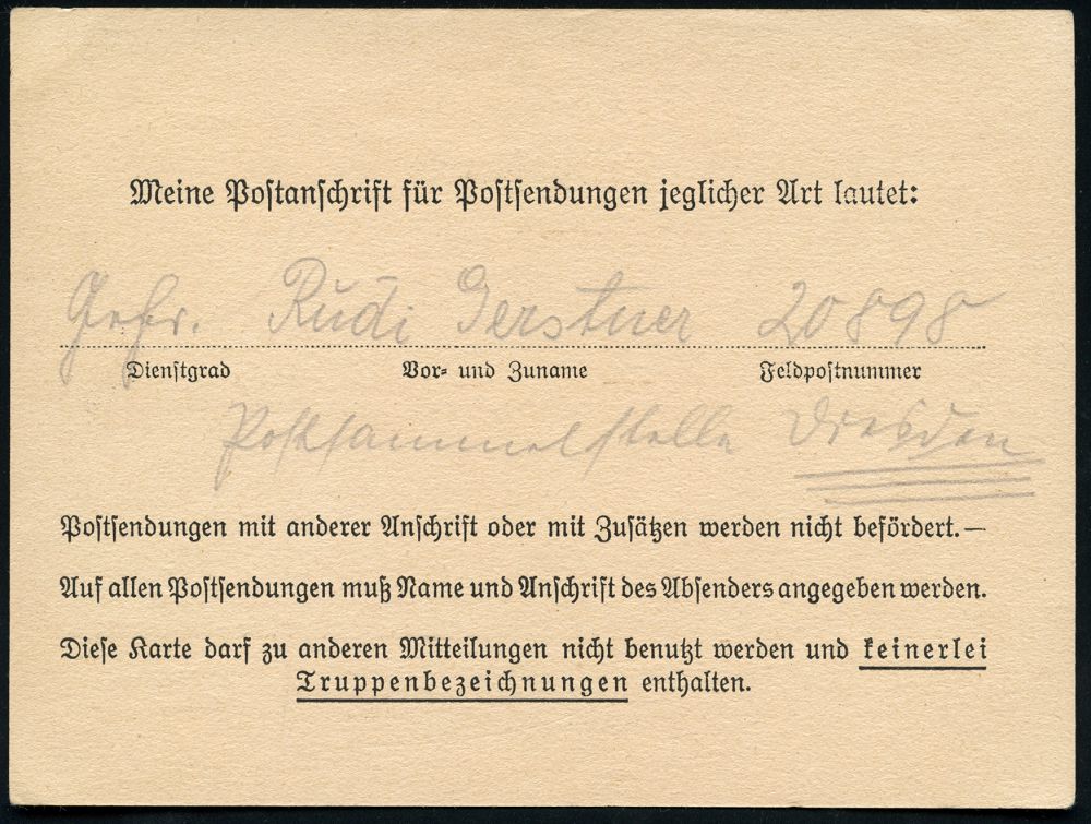 2170 | 15 € | II. WELTKRIEG (1939 - 1945) : GUBEN 1/ o 1942 (28.11.) 2K-Steg + viol. 1K-HdN: Art.-Ausb.-Abt. (m) Großdeutschland , rs. hs. Abs.: ..3. Marsch-Battr. Art. Ers. Abt. "Großdeutschland", Feldpost-Faltbf. mit Inhalt! n. Plank "Großdeutschland" war ein Elite-Verband ! | ![]() ![]() | |