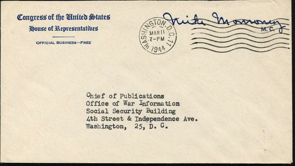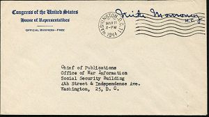 2612 | 25 € | II. WELTKRIEG (1939 - 1945) : U.S.A. 1944 (11.3.) markenloser Dienst-Bf.: Congress of the United States/ House of Representatives../FREE + MaWellenSt.: WASHINGTON , D.C. = Mitglied des Repräsentantenhauses, portofreier Orts-Bf. (Faksimile des Abgeordneten!) | ![]() | |