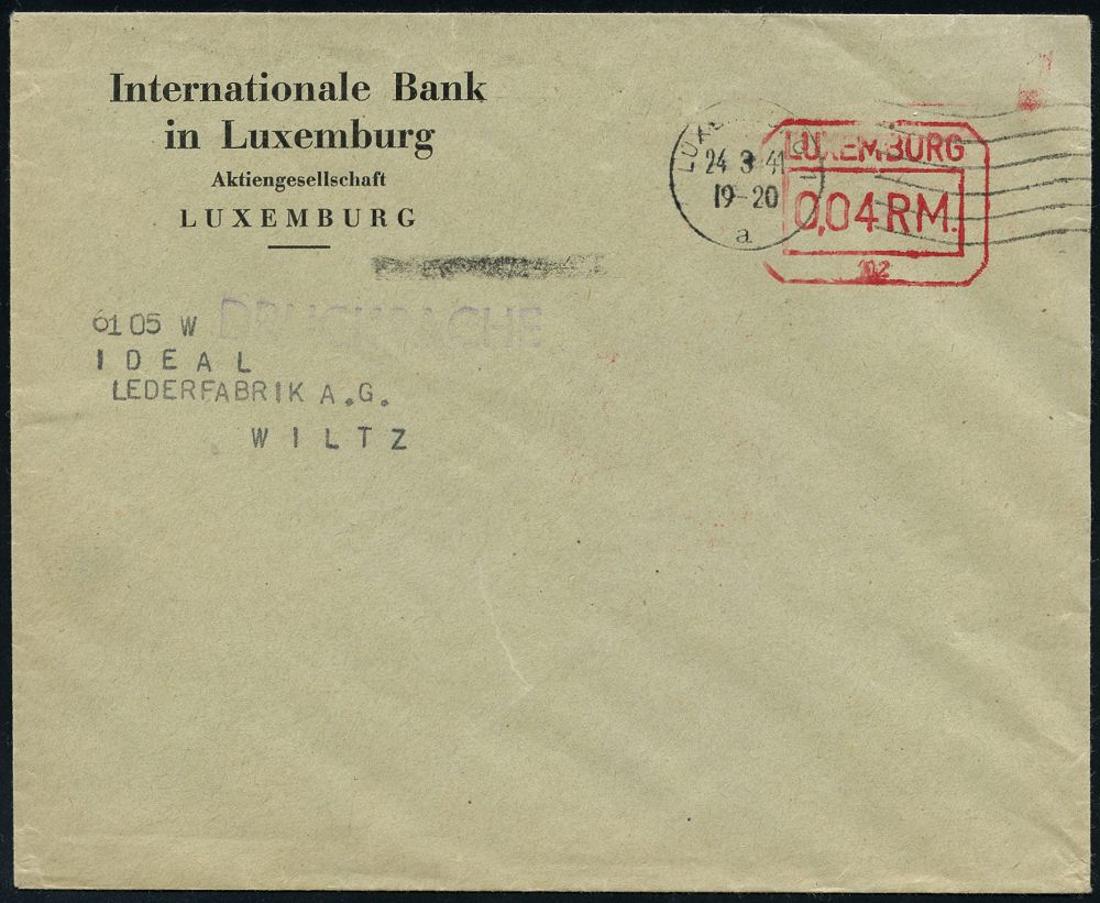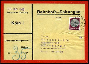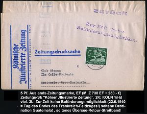 2164 | 40 € | II. WELTKRIEG (1939 - 1945) : FRANKFURT (MAIN)/ 1/ SDDH/ Lest/ Das Jllustrierte Blatt/ Frankfurter Jllustrierte 1940 (17.6.) AFS Francotyp "Reichsadler" 155 Pf. auf Zeitungs-Streifband.: "Mit Luftpost nach Südamerika" o h n e Zensur via italien. Luftpost nach Einstellung der deutschen Katapult-Luftpost (mit LATI) gedruckter LPZ nach Buenos Aires, seltene Portostufe!, rs. AS., seltener Beleg! (Dü.E-5DGo) | ![]() ![]() | |