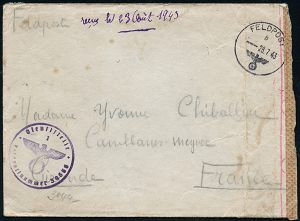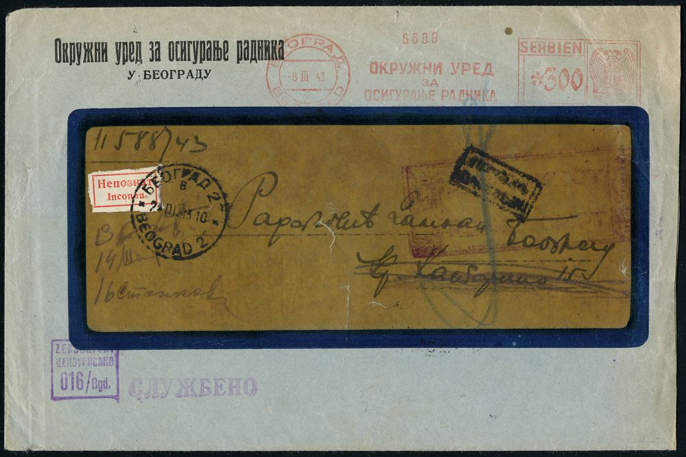 2521 | 75 € | II. WELTKRIEG (1939 - 1945) : DT.BES.SERBIEN 1943 (8.III.) AFS Francotyp "SERBIEN".: BEOGRAD/OKRUSCHNI URED.. (kyrillischer Text) *300 (Para) + viol. deutsch-kyrill. Zensur-Ra.3: ZENSURIERT../016/Bgd. = Belgrad (Rie.Ju-7 a) ebenso rs. + amtl. Klebezettel: ..Iconnu (unbekannt), sehr seltener Inl.-Zensur-Retour-Bf. (Francotyp CAh) | ![]() | |