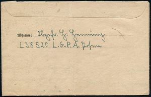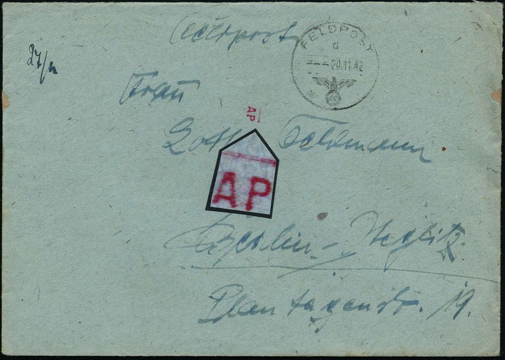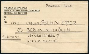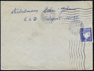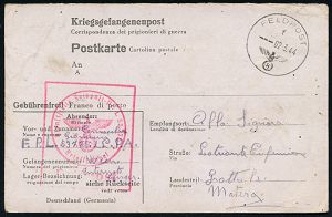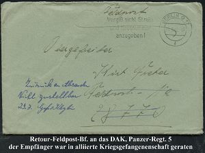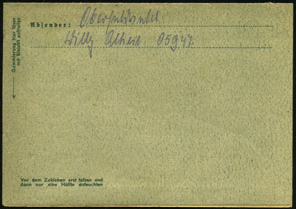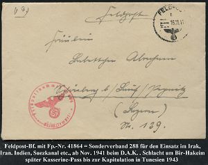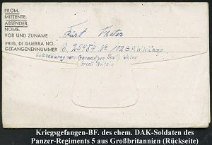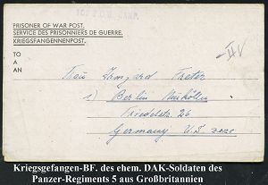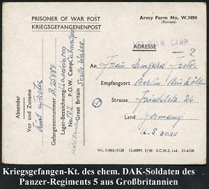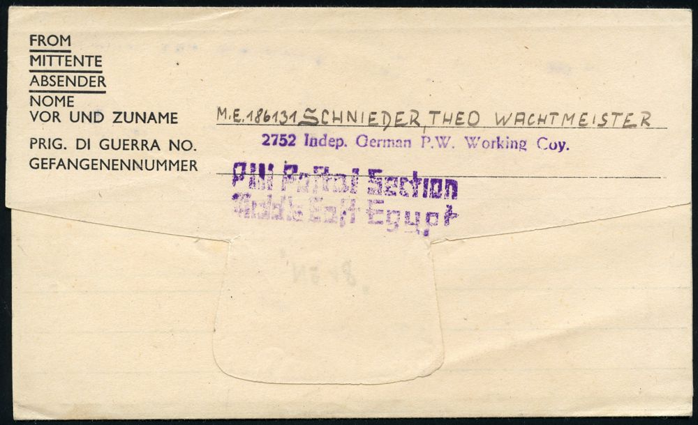 2532 | 18 € | II. WELTKRIEG (1939 - 1945) : ÄGYPTEN / GROSSBRITANNIEN / D.A.K. 1944 (ca.) viol. 2L: P W Postal Section/ Middle east Egypt + teils hs., teils gestempelter Abs.: M.E. 186131.. / 2752 Indep. German P.W. Working Coy , Kriegs-Gef.-Falt-Bf. eines D.A.K. (Afrikakorps)-Soldaten (ohne Inhalt) n. Bln-Neukölln | ![]() ![]() | |
