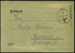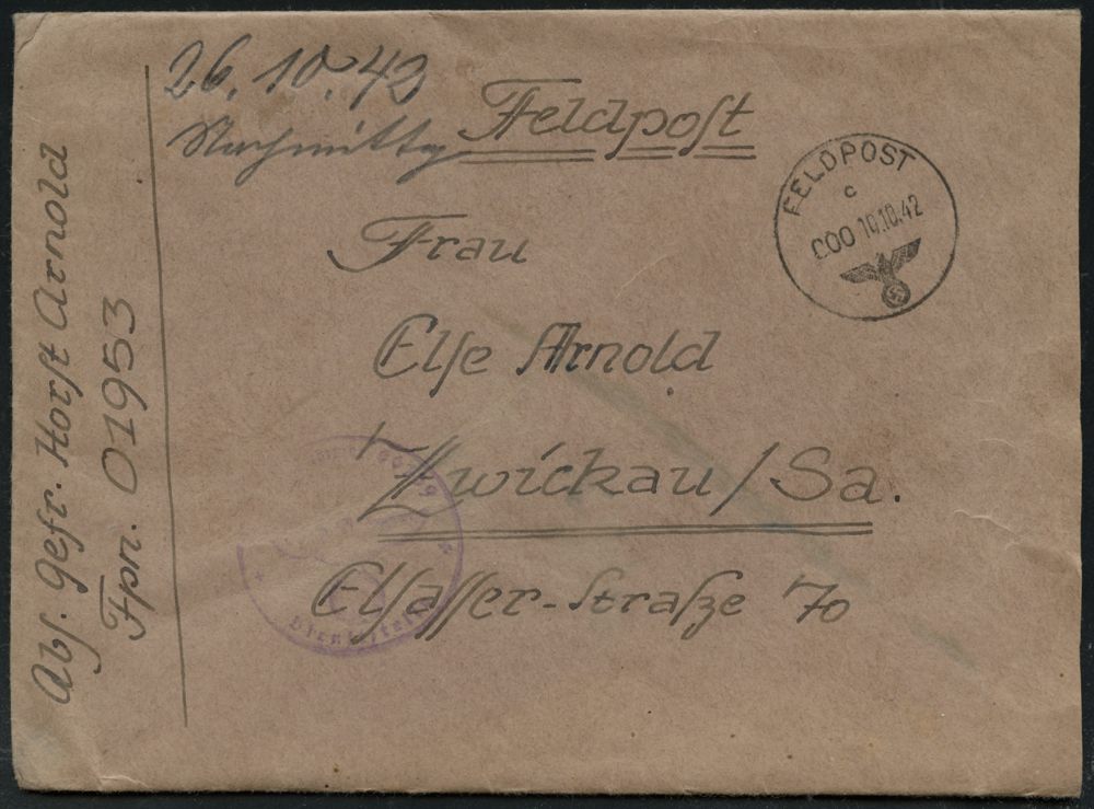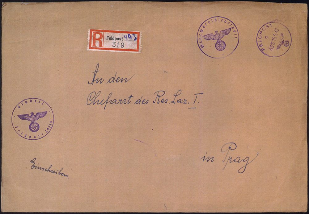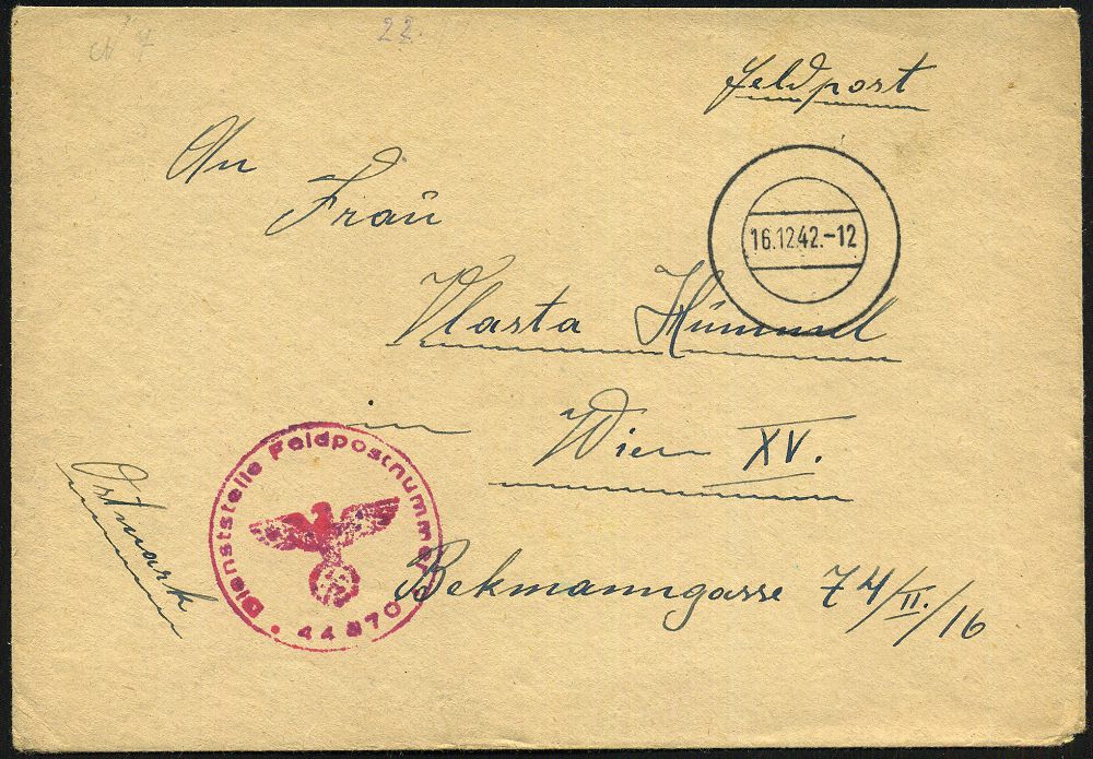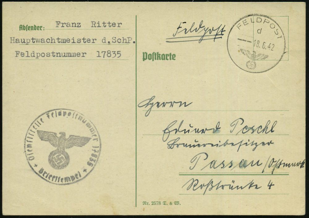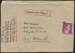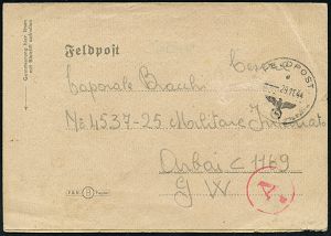 2526 | 20 € | II. WELTKRIEG (1939 - 1945) : DT.BES.UKRAINE 1942 (29.4.) stummer, ehem. sowjet. Segment-1K + viol. 1K-HdN: Feldpostnr. 13199 = Befehlshaber Ukraine, Kommandeur es Heeres-Streifendienstes = Polizei-Einheit , auch zur Bekämpfung von Partisanen, dem Kidnapping von Zwangsarbeitern u. Zivilbevölkerung eingesetzt!, Feldpost-Bf. + Inhalt n. Wien | ![]() ![]() | |