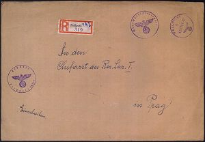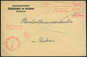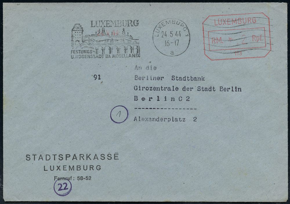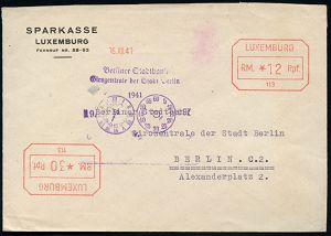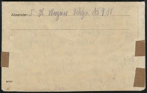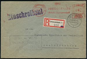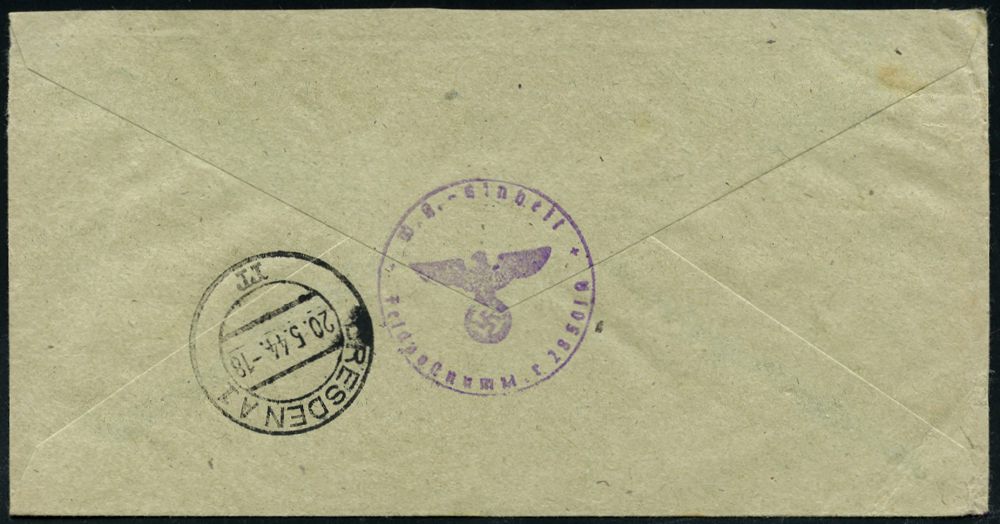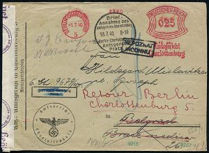 2096 | 25 € | II. WELTKRIEG (1939 - 1945) : BERLIN-CHARLOTTENBURG/ 5/ Amtsgericht.. 1940 (3.7.) AFS Francotyp "Bogenrechteck" 025 Pf. auf Dienst-Bf.: Amtsgericht.. Frei durch Ablösung Reich = gestrichen, da Ausl.-Versand keine Ablösung!, OKW-Zensurstreifen + roter Band-MaSt. "g" = Wien (Rie.G-20, nur Mai - Nov. 1940, G-53 a) rs. rote Siegeloblate, seltener Ausl.-Zensur-Retour-Bf. n. Belgrad, schw. Ra.2: ..INCONNU + rs. AS. etc. (Dü.E-1BAh) | ![]() ![]() | |