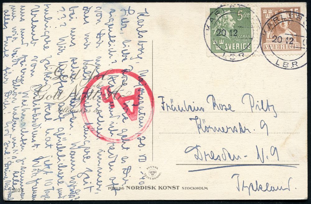 2569 | 25 € | II. WELTKRIEG (1939 - 1945) : SCHWEDEN 1940 (20.12.) 2K-Steg: KARLSBORG auf Freimarke 5 Ö. u. 15 Ö., großer, roter OKW-Zensur-1K: A b = Berlin (Rie.B-30 a, + 500 Pkte.!) seltene Ausl.-Zensur-Weihnachts-Ak mit Tbc-Spendenmarke n. Dresden | ![]() ![]() | |