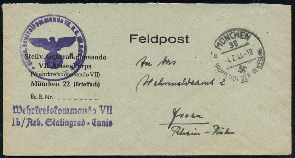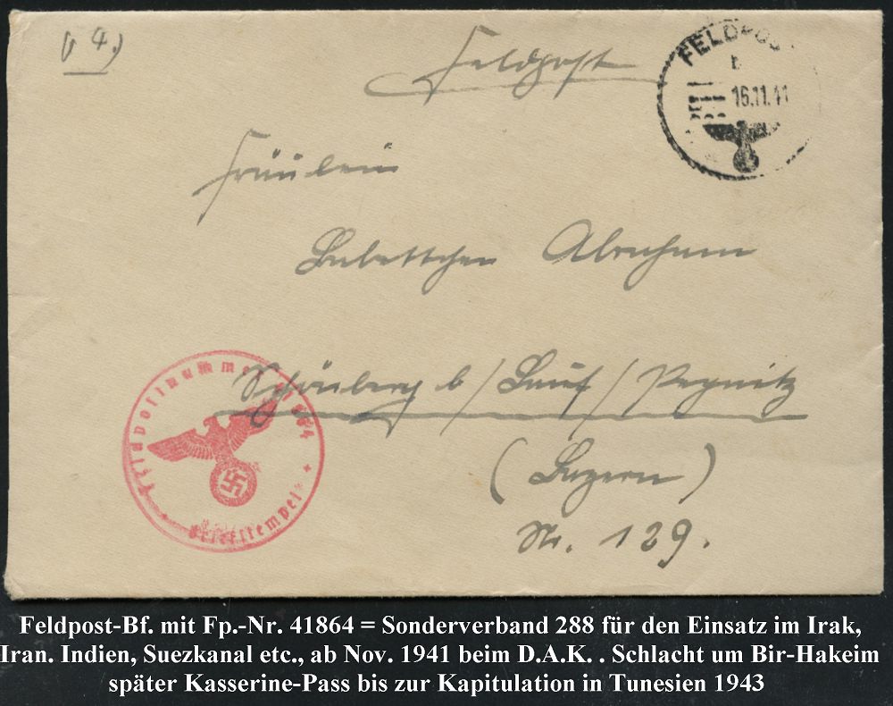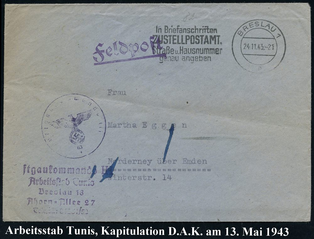 2142 | 45 € | II. WELTKRIEG (1939 - 1945) : BRESLAU 1/ p/ In Briefabschriften/ ZUSTELLPOSTAMT/ ..angeben 1943 (24.11.) Serien-MWSt + viol. 1K-HdN. Ostgaukommando III + 4L: Ostgaukommando III/ Arbeitsstab T u n i s / Breslau 18 = Abwicklung Deutsches Afrika-Korps, D.A.K.-Kapitulation in Tunis am 13. Mai 1943, Feldpost-Bf. n. Norderney (Bo.S 82 A) | ![]() | |