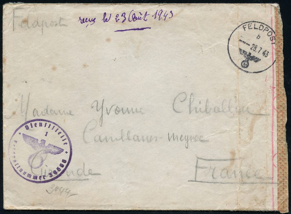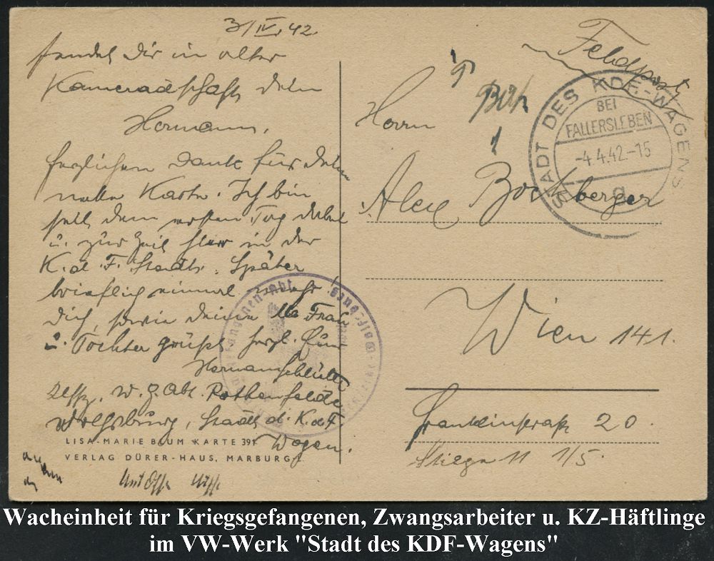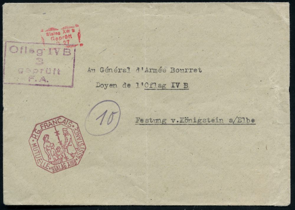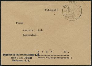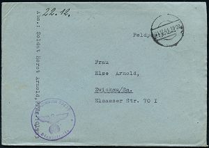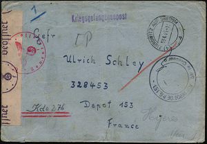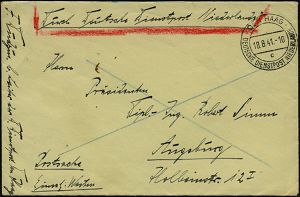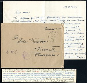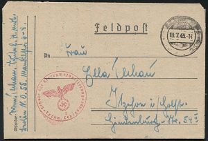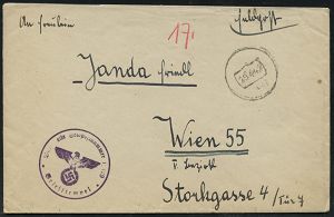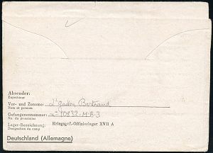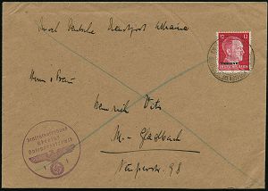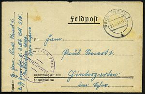 2155 | 16 € | II. WELTKRIEG (1939 - 1945) : Edelbach 1941 (24.12.) stummer 2K-Steg = Tarnstempel Edelbach + roter 1L: Besetzes Gebiet + roter Zensur-Ra.3: OFLAG/410 XVII A/GEPRÜFT (Wo.49 b, 75 Pkte.) Offiziers-Kgf.-Faltbf. mit Inhalt n. Laval, Frankreich | ![]() ![]() | |
