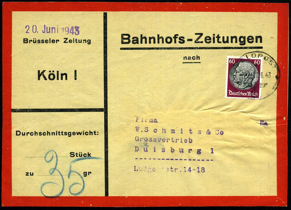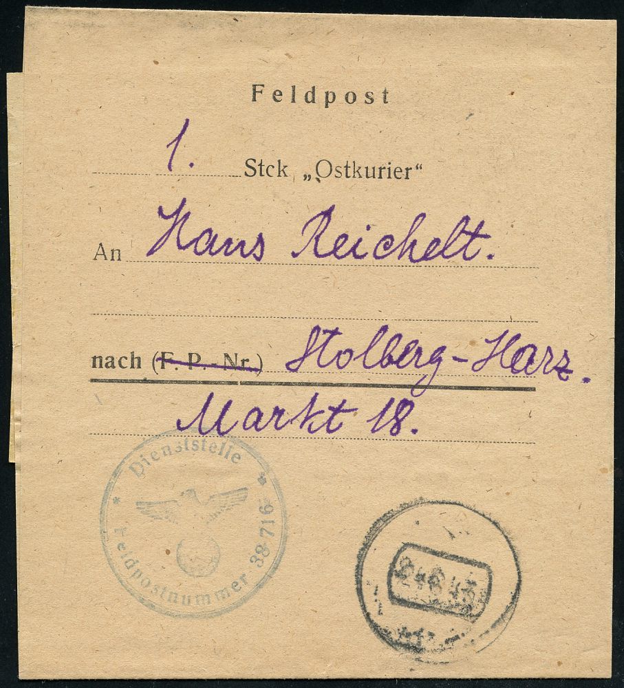 2524 | 30 € | II. WELTKRIEG (1939 - 1945) : DT.BES.UKRAINE 1943 (24.6.) Zeitungs-Streifband.: Feldpost "Ostkurier" + bl. 2K-HdN: Dienststelle/Feldpostnummer 38 716 = Propaganda-Abt. Ukraine, klar gest. seltenes Feldpost-Steifband an zivile Adresse in Torgau | ![]() | |