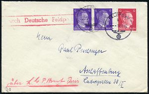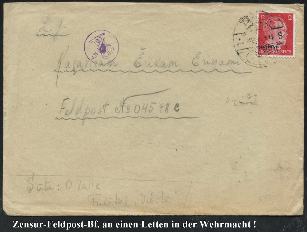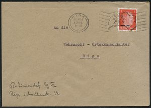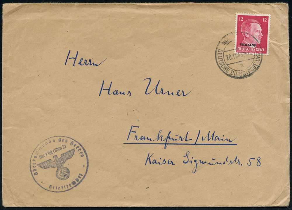 2530 | 12 € | II. WELTKRIEG (1939 - 1945) : DT.BES.UKRAINE 1943 (20.11.) 12 Pf. Hitler, EF auf Wehrmachts-Dienst-Bf., 1K-HdN: Oberkommando des Heeres/ Wa J RU (Mun) 3 (OrtsStpl. oben undeutl.) n. Frankfurt/M. = Europa-(Inlands)-Tarif ! (Mi.8 EF) | ![]() | |