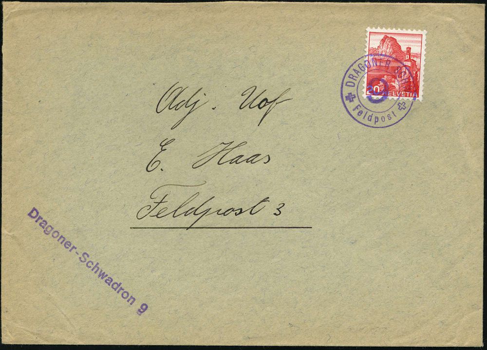 2578 | 16 € | II. WELTKRIEG (1939 - 1945) : SCHWEIZ 1940 20 C. Flp. EF, viol. Feldpost-2K: D R A G O N E R SCHW.(ADRON)/23/Feldpost a. Inl-Bf. (schwache Falte) n.Zürich (Mi.213 EF) | ![]() | |