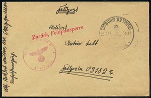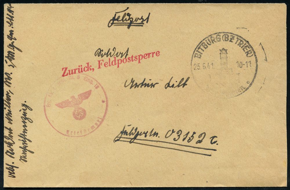2139 | 50 € | II. WELTKRIEG (1939 - 1945) : BIBURG (BZ TRIER) 1941 (25.6.) HWSt + seltener, roter 1L: Zurück, Feldpost s p e r r e + roter 1K-HdN der Fp.-Nr. 03152 = Artl. Regt. 33, 15. Panzer-Div., Deutsches Afrika-Korps, D.A.K. , seltener Feldpost-Retour-Bf. | ![]() | |
