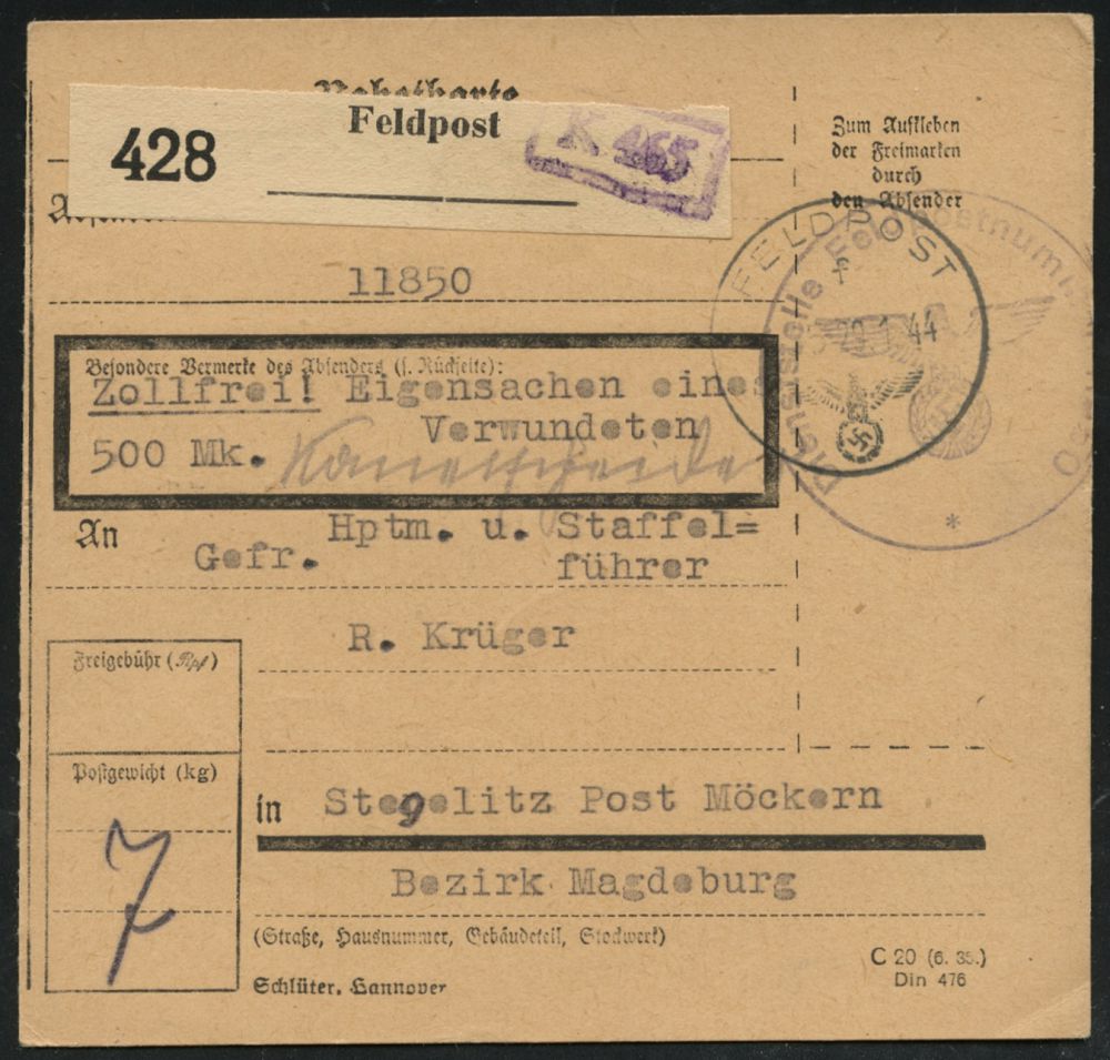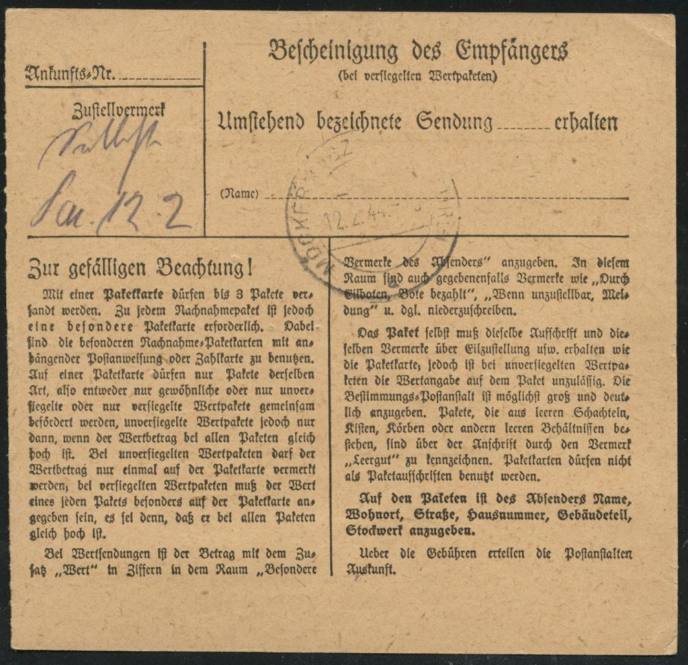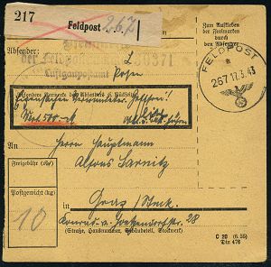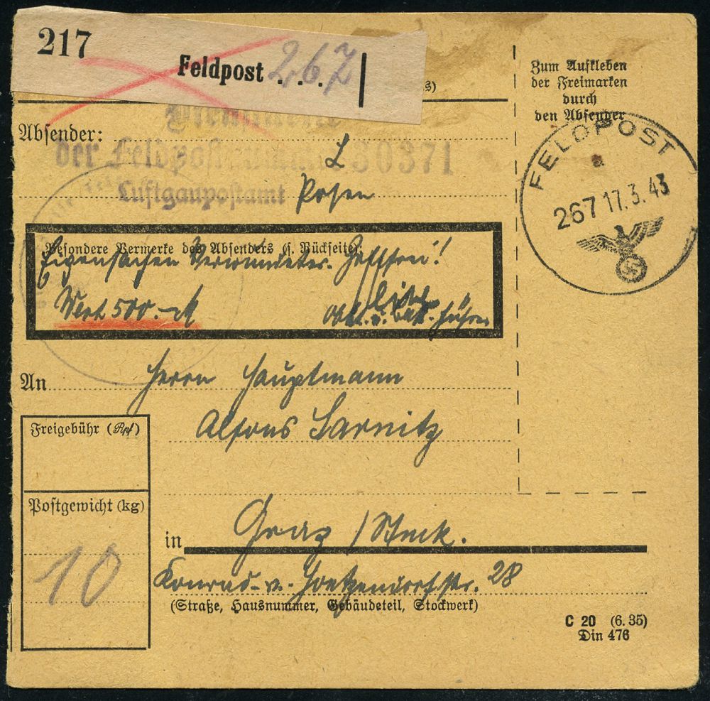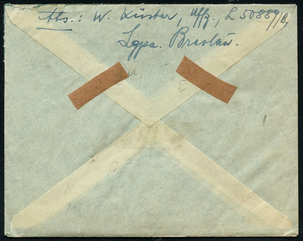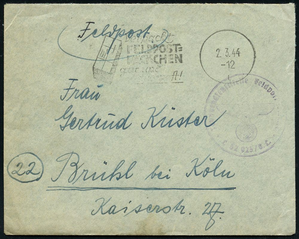 2143 | 20 € | II. WELTKRIEG (1939 - 1945) : Breslau 1944 (2.3.) stummer MaWSt.: Verpackt/FELDPOST-/PÄCKCHEN/gut u./dauerhaft! = Tarnstempel Breslau + 1K-HdN: Fp.-Nr. L 32925 = Fliegerhorst Kdtur. 19/XII , rs. hs. Abs.: "..L 50889, Lgpa Breslau" = Stab Flak-Regt. 46, kleiner Feldpost-Bf. + Inhalt n. Brühl (Bo.S 410 A Tarnstpl.) | ![]() ![]() | |