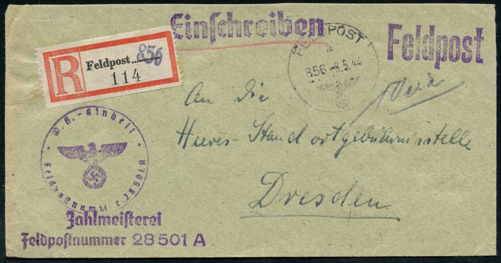 2152 | 18 € | II. WELTKRIEG (1939 - 1945) : DRESDEN N 15/ e 1942 (17.1.) 2K-Steg + RZ: Dresden N 15/p + viol. 1K-HdN: Heeres - E n t l a s s u n g s s t e l l e 3-IV/Dresden , klar gest. Feldpost-R-Bf. n. Meißen | ![]() | |