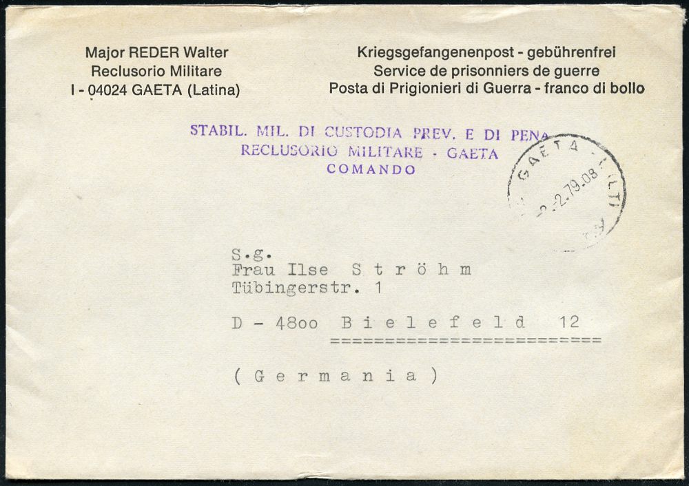 2556 | 65 € | II. WELTKRIEG (1939 - 1945) : ITALIEN / ÖSTERREICH 1979 (3.2.) 1K: GAETA auf dreisprachigem Vordruck-Bf.: Kriegsgefangenenpost - gebührenfrei.. Major REDER Walter, Reclusorio Militare.. + viol. Zensur-3L: STABIL. MIL. DI CUSTODIA../COMANDO, Kgf.-Ausl.-Bf. + Inhalt mit orig. Signatur "Walter Reder", SS-Sturmbannführer , 16. SS-Panzer-Gren.-Div. "Reichsführer SS", angeklagt der Kriegsverbrechen in Nord-Italien (Erschießung von Zivilisten, Zerstörung von Marzabotto etc.) 2 Belege kompl. n. Bielefeld | ![]() ![]() | |
