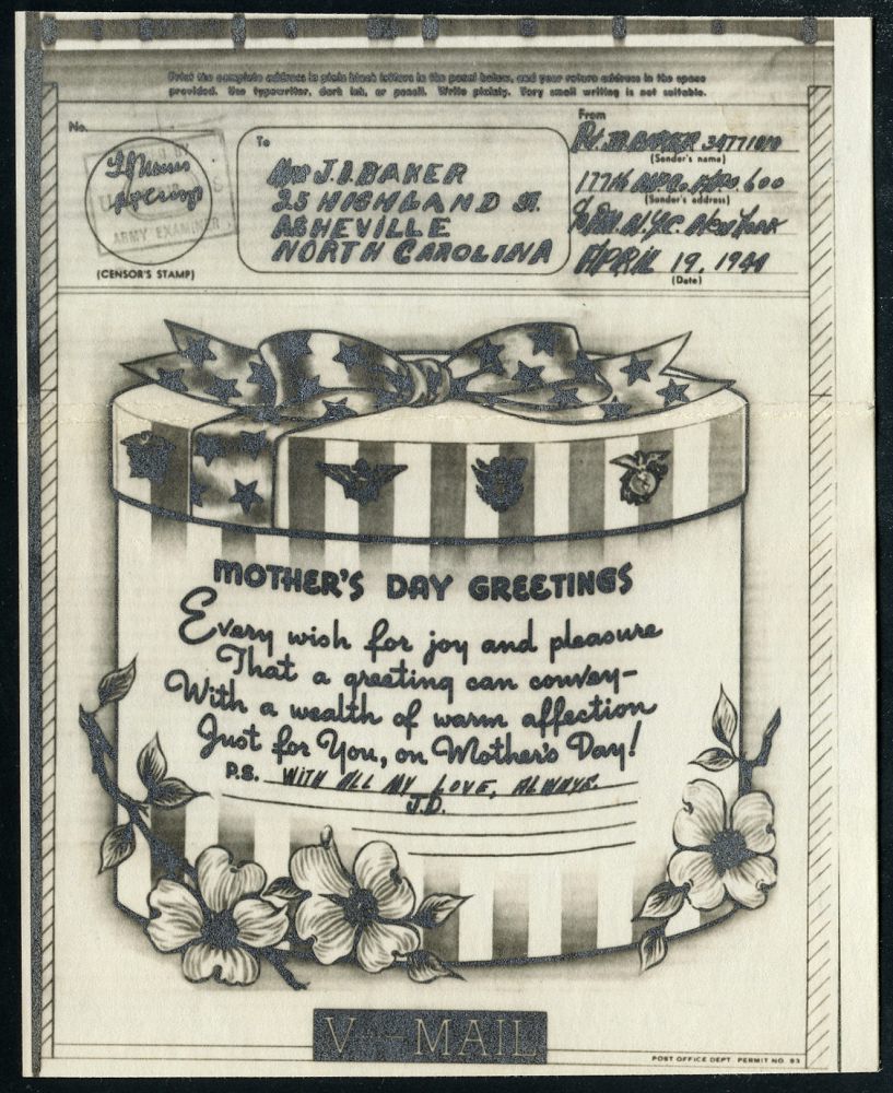 2606 | 25 € | II. WELTKRIEG (1939 - 1945) : U.S.A. 1941 (19.4.) Airgraph "MOTHER´s DAY GREETINGS.." V-MAIL = patriot. Geschenkpackung, APO 600 = Oran, Algerien (Bugspur) + Zensur-Vermerk (ARMY EXAMINER) n. Asheville, North Carolina | ![]() | |