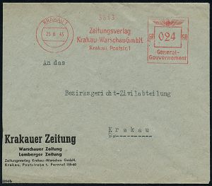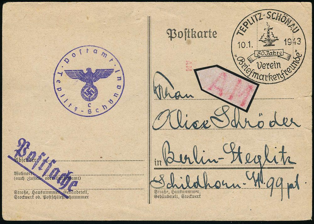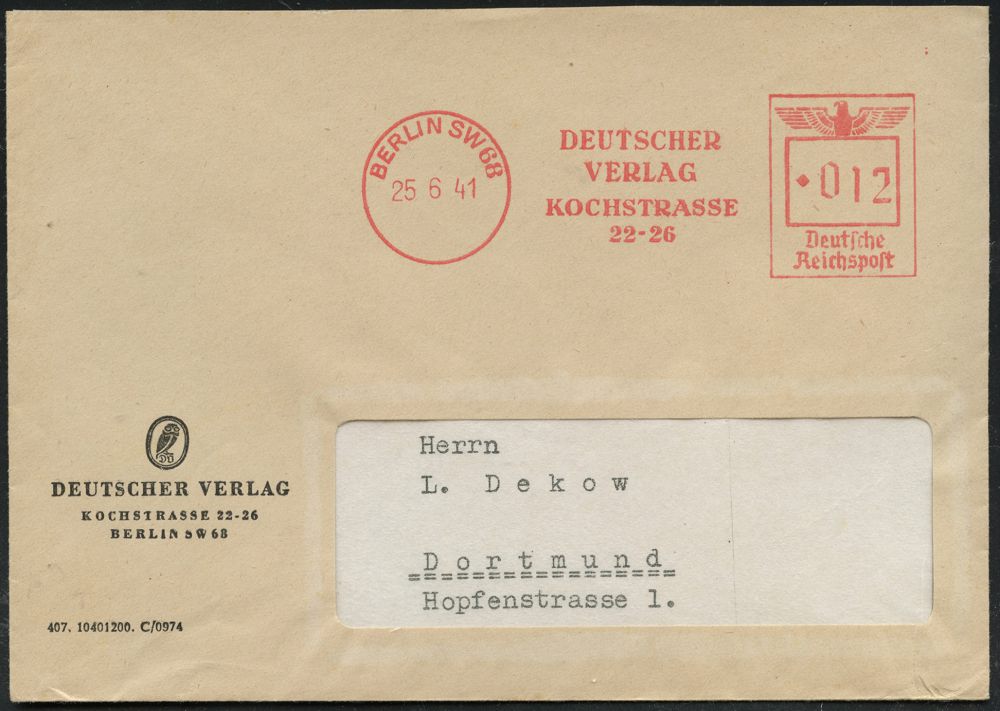 2101 | 25 € | II. WELTKRIEG (1939 - 1945) : BERLIN SW/ 68/ DEUTSCHER/ VERLAG/ KOCHSTRASSE/ 22-26 1941 (25.6.) AFS Francotyp "Reichsadler" = "arisierter" jüdischer Ullstein-Verlag , Zwangsverkauf am 10.Juni 1934 an Cautio GmbH = NSDAP-Tarnfirma (Max Winkler!) Fern-Bf. mit altem Ullstein-Logo: Eule (Dü.E-5DG) | ![]() | |