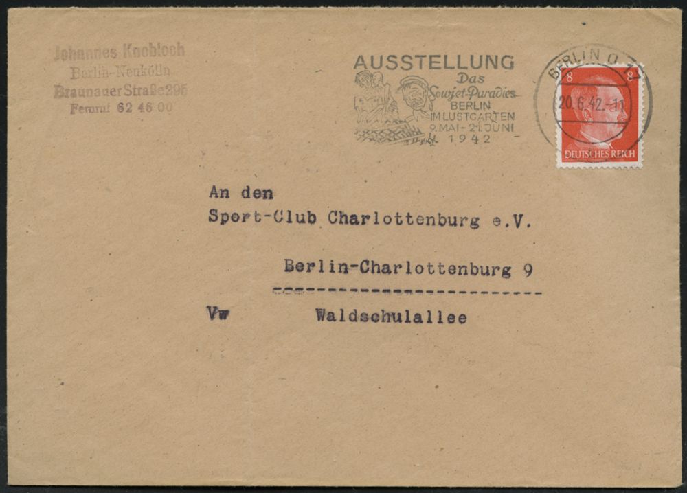 2113 | 20 € | II. WELTKRIEG (1939 - 1945) : BERLIN/ AUSSTELLUNG/ b/ Das Sowjet-Paradies.. 1942 (23.5.) seltener SSt + viol.3L: Sonderstempelstelle.. auf frankiertem Antwort-Bf. (daher schwache Falte) mit Zusatz-1L: "Postsache", weitere Belefe siehe auch Sektion: DEUTSCH-SOWJET. BEZIEHUNGEN (Bo.376 b = seltene Type) | ![]() | |
