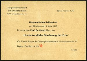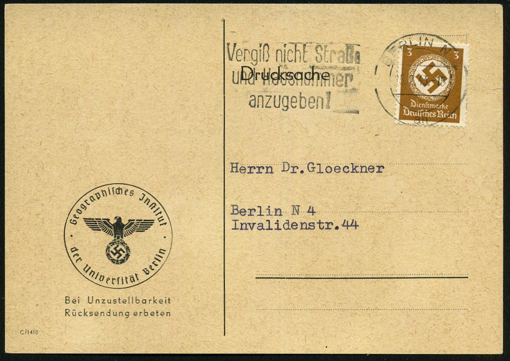 2124 | 16 € | II. WELTKRIEG (1939 - 1945) : Berlin N 4 1943 (15.2.) 3 Pf. Behördendienst, Ef auf Vordr.-Kt.: Geografisches Jnstitut der Universität Berlin , Einladungskarte zu Vortrag "Länderkundliche Gliederung der Erde" (Prof. Dr. Maull (Graz) Orts-Dienst-Kt., die NS-Machthaber wollten die "Karte Europas" gründlich verändern! (Mi.D 132 EF) | ![]() ![]() | |