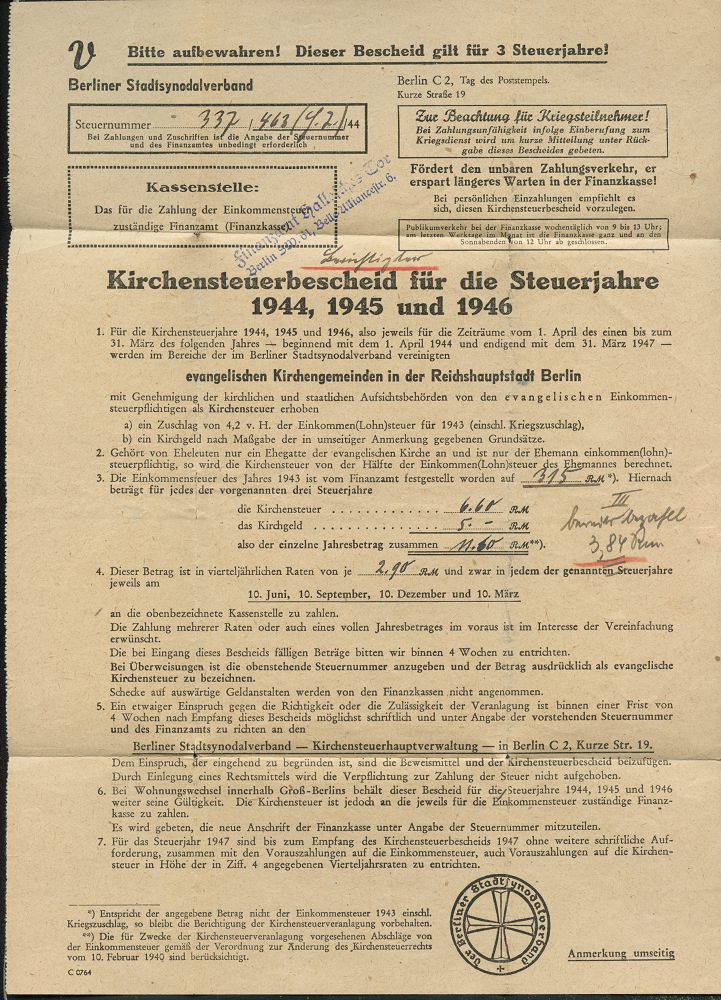 2134 | 40 € | II. WELTKRIEG (1939 - 1945) : (1) BERLIN C 2/ Berliner/ Stadtsynodal-/ verband 1944 (16.12.) AFS Francotyp "Reichsadler" 008 Pf. mit PLGZ + bl. Abs.-2L: Finanzamt Halesches Tor/ Berlin SW 68.. (Amtshilfe!) Orts-Falt-Bf. mit Inhalt = Kirchensteuerbescheid 1944, 1945 und 1946! + viol. 1K: (1) zugestempelt nach SW 61, sehr seltener Übergangsbeleg zwischen Krieg u. Frieden! (Dü.E-5CGh) | ![]() ![]() | |