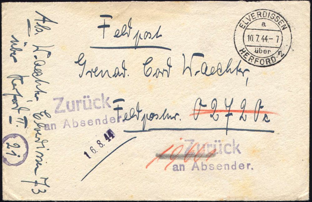 2158 | 16 € | II. WELTKRIEG (1939 - 1945) : ELVERDISSEN/ a/ über/ HERFORD 2 1944 (10.7.) 2K-Steg = PSt.I + viol. 2L: Zurück/an Absender 2x klar gest. Feldpost-Retour-Bf. an d. Fp.-Nr. 02720 = Gren.Rgt. 157 Memel-Königsberg, Juli 1944 Abwehrkämpfe in Litauen | ![]() | |
