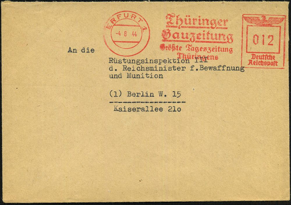 2161 | 18 € | II. WELTKRIEG (1939 - 1945) : ERFURT 1/ Thüringer/ Gauzeitung/ Größte Tageszeitung/ Thüringens 1944 (4.8.) AFS Francotyp "Reichsadler" auf Fernbf. an Rüstungsminister (= Alb. Speer) , Berlin (Dü.E-5CGo) | ![]() | |