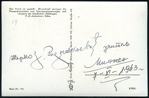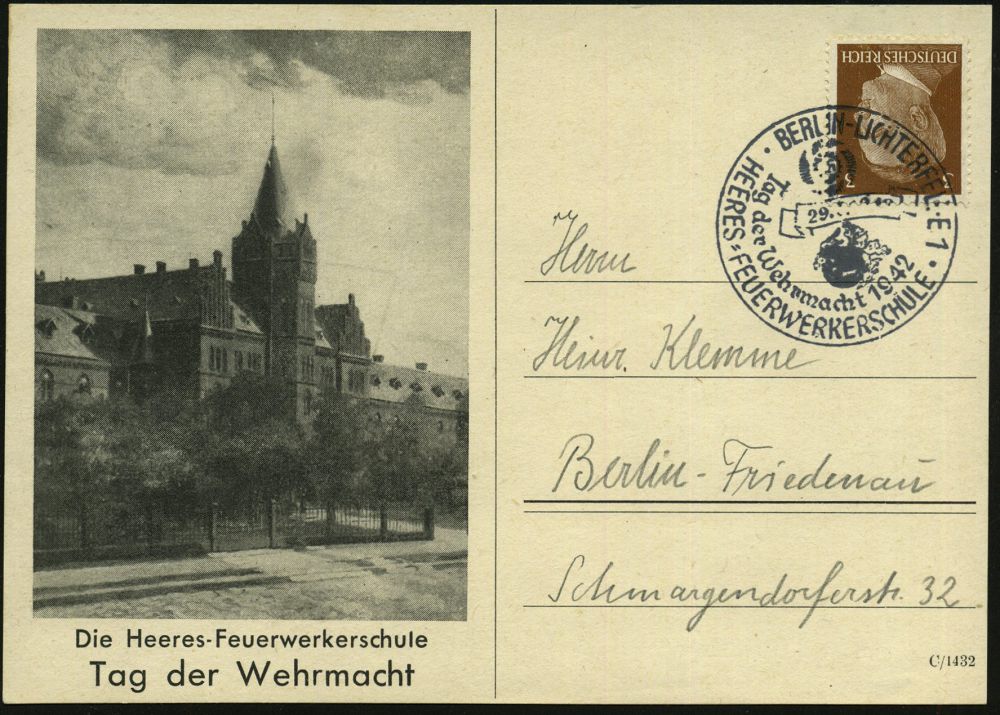 2109 | 25 € | II. WELTKRIEG (1939 - 1945) : BERLIN-LICHTERFELDE 1/ Tag der Wehrmacht/ HEERES-FEUERWERKERSCHULE 1942 (29.3.) seltener SSt (stilis. Bombe) = Schule für Pyrotechnik , Munition- u. Bomben-Entschärfung!, klar gest., seltene s/w.-Sonder-Kt.: Die Heeres-Feuerwerkeschule, Tag der Wehrmacht, vergl. Los Nr. 2106, 2108 (Bo.372) | ![]() | |