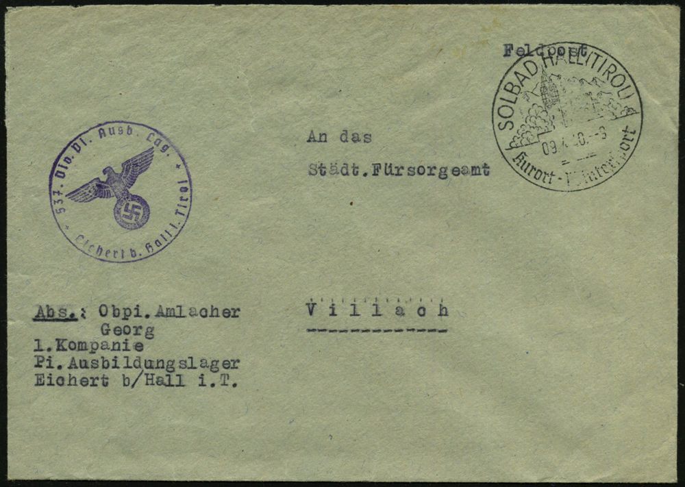 2171 | 12 € | II. WELTKRIEG (1939 - 1945) : SOLBAD HALL (TIROL)/ Kurort-Wintersport 1940 (9.4.) HWSt + schw. 1K-HdN: 537. Div. Pi.(onier) Ausb. Lag.(er)/Eichert b. Hall Tirol , Feldpost-Bf. n. Villach (Bo.1) | ![]() | |