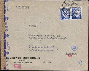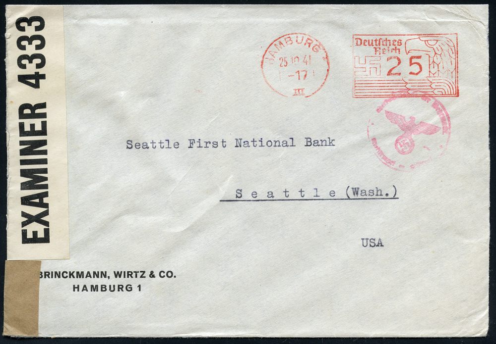 2172 | 70 € | II. WELTKRIEG (1939 - 1945) : HAMBURG 1/ III/ Deutsches/ Reich 1941 (25.10.) PFS "Adlerkopf/Hakenkreuz" 25 Pf. + roter OKW-Zensur-1K = Köln + britische Transit-Zensurstreifen: OPENED BY/EXAMINER 4333/P.C.90, seltener Übersee-Doppel-Zensur-Bf. Fa. Brinckmann, Wirtz & Co = "arisierte" Warburg-Bank n. Seattle, USA wenige Wochen vor US-Kriegs -Eintritt der USA, sehr seltener Beleg u. PFS-Portostufe! (Dü.D-6) | ![]() ![]() | |