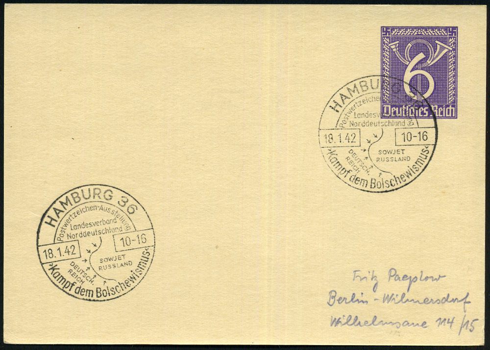 2173 | 25 € | II. WELTKRIEG (1939 - 1945) : HAMBURG 36/ "Kampf dem Bolschewismus"/ Postwertz.Ausstellung 1942 (18.1.) seltener SSt = Angriffspfeile auf Sowjet-Rußland, klar auf seltener PP 6 Pf. Posthorn (Mi.PP 150/A 1 = Blanco-PP, + 45.- EUR) seltene Inl.-Karte erinnert an das Unternehmen "Barbarossa", Invasion der UdSSR (Bo.117) | ![]() | |