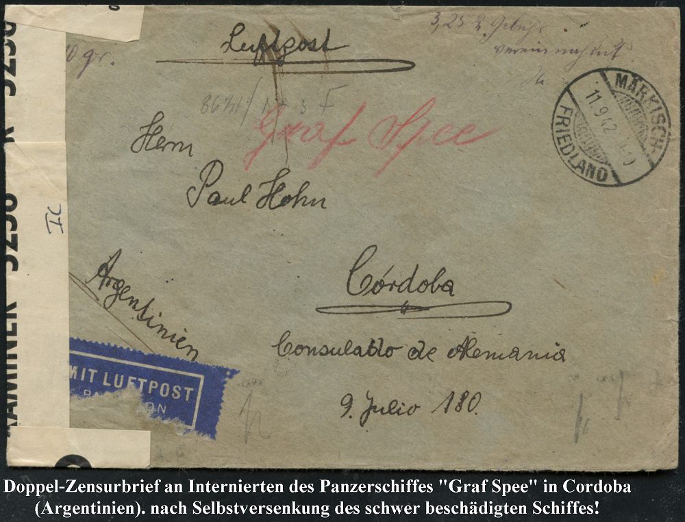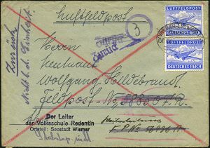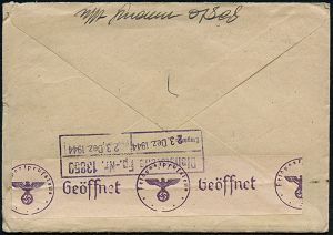 2130 | 28 € | II. WELTKRIEG (1939 - 1945) : BERLIN,S./ 14/ s 1944 (10.1.) 1K-Brücke + hs.Vermerk "Taxe percue 0,40 RM.." = n u r Luftpost-Gebühr! + OKW-Zensurstreifen + roter OKW-Zensur-1K "geprüft" + OKW-Zensurstreifen "Geöffnet/b" = Berlin (Rie.B-5 a + 150 Pkte. etc.) + US-Streifen + 2L: 11595/ U.S.CENSOR, Übersee-Flp-Doppel-Zensur-Bf. n. Mexia, USA (vergl. Los Nr. 2131 u.a.) | ![]() ![]() | |