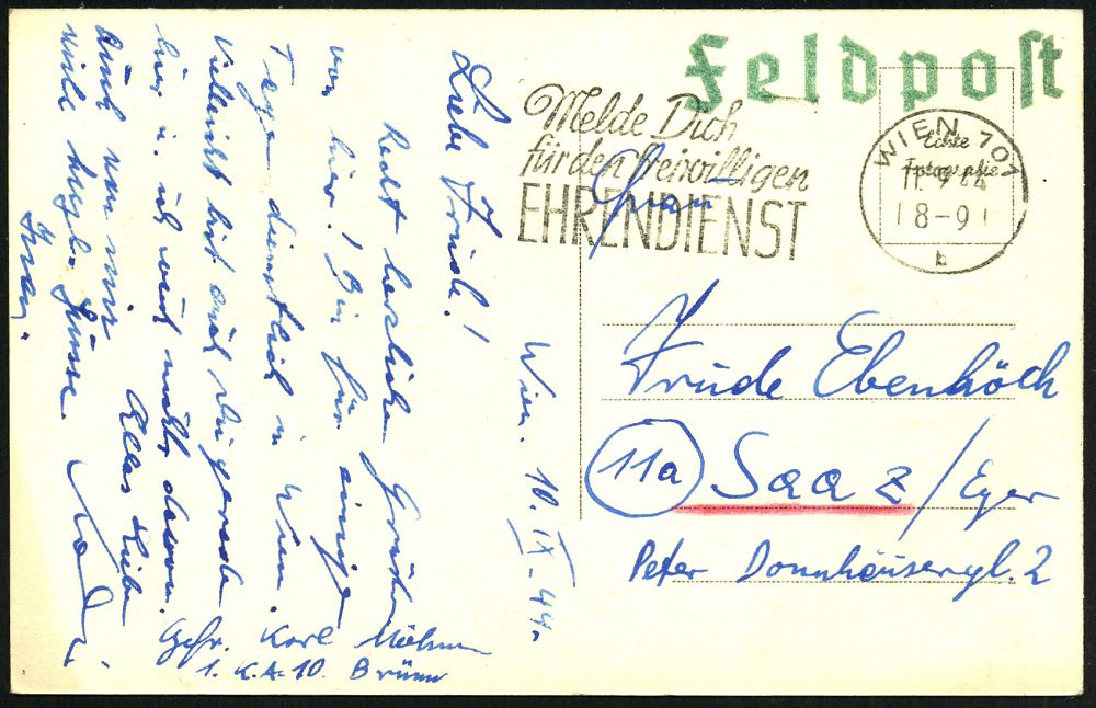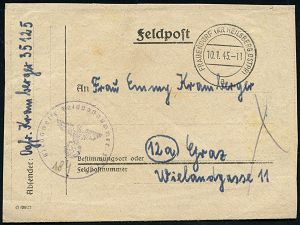 2165 | 20 € | II. WELTKRIEG (1939 - 1945) : FRAUENDORF (KR HEILSBERG, OSTPR)/ a 1945 (8.1.) 2K-Steg + viol. 1K-HdN: Fp. Nr. 35125 = Nachrichten-Abt. 71 = Ostpreußen-Feldpost ! + hs. Fp.-Nr., später Feldpost-Bf. mit Inhalt n.Graz | ![]() | |