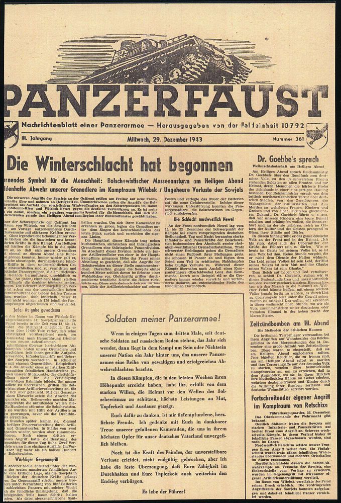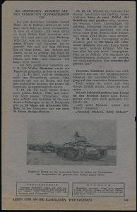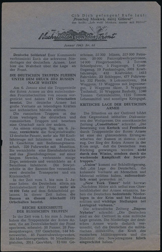 2592 | 30 € | II. WELTKRIEG (1939 - 1945) : UdSSR / DEUTSCHES REICH 1942 (Jan.) sowjet. deutsch-sprachiges Propaganda-Flugblatt Nr.665: "Nachrichen von d.Front Nr.65" über d.Niederlage vor Moskau, rs. Abb.: brit. Panzer aus dem Lend-Lease-Vertrag (kl. Randmäng.). selten! | ![]() ![]() | |